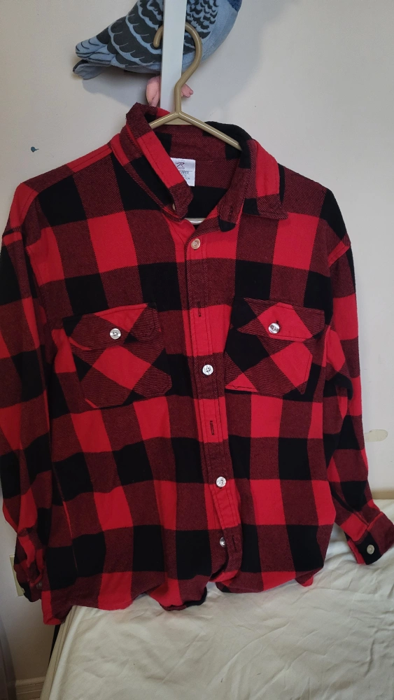 Men's long-sleeve flannel shirt. Red and black buffalo check pattern. Two chest pockets. Button closure. 100% cotton. Meet up at St. James Community Centre (Sherbourne and Wellesley)