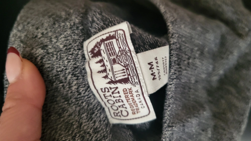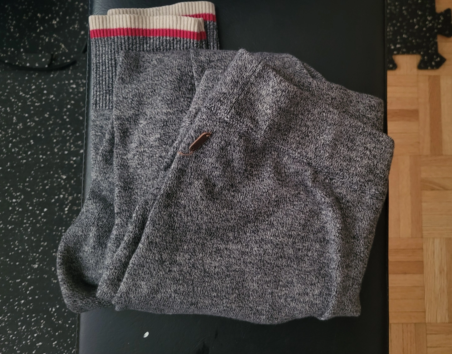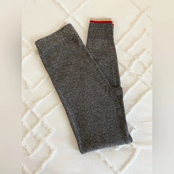 Grey heather leggings. Medium size. Features ribbed cuffs with red and beige accents. Meet up at St. James Community Centre (Sherbourne and Wellesley)
