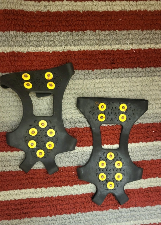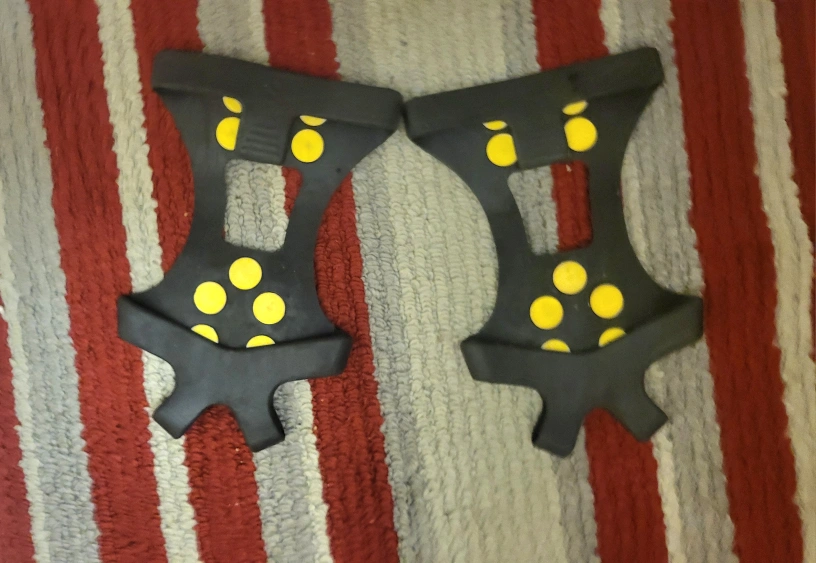 Pair of reusable ice grips. Black rubber with yellow studs. Good for traction on ice and snow. Easy to attach to footwear.