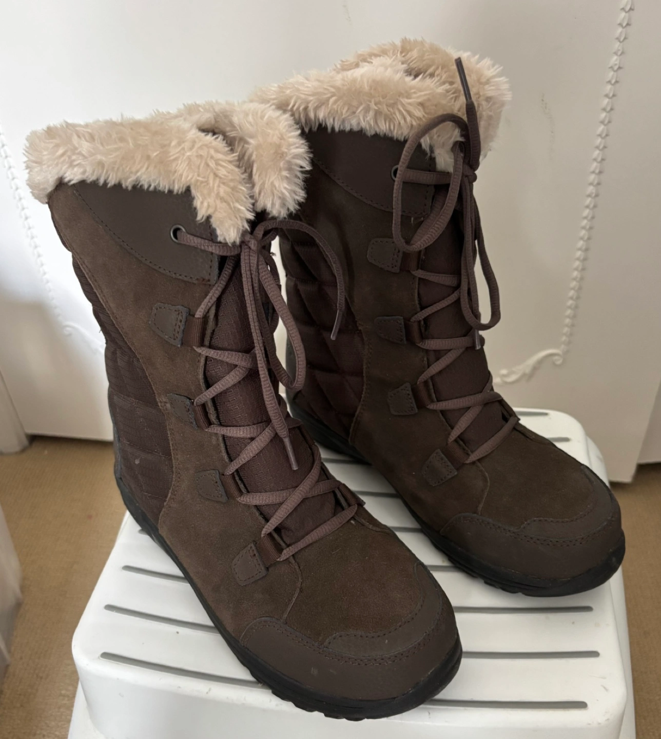 Brown winter boots with faux fur lining. Lace-up closure. Good traction soles. Women's size 8.5. Needed bigger size. Great condition. Smoke free home Cash only