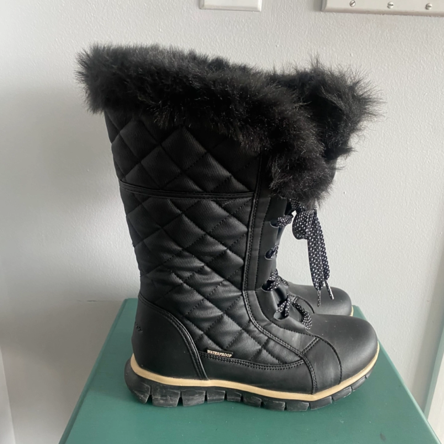Like new, worn once. Waterproof! Comfort insole. Had foot surgery and too small for me, but I didn’t return on time. Women's black winter boots. Lace-up style. . Faux fur lined . Excellent for cold weather. Comfortable and stylish. Great traction for snow Paid 130.00 plus taxes originally