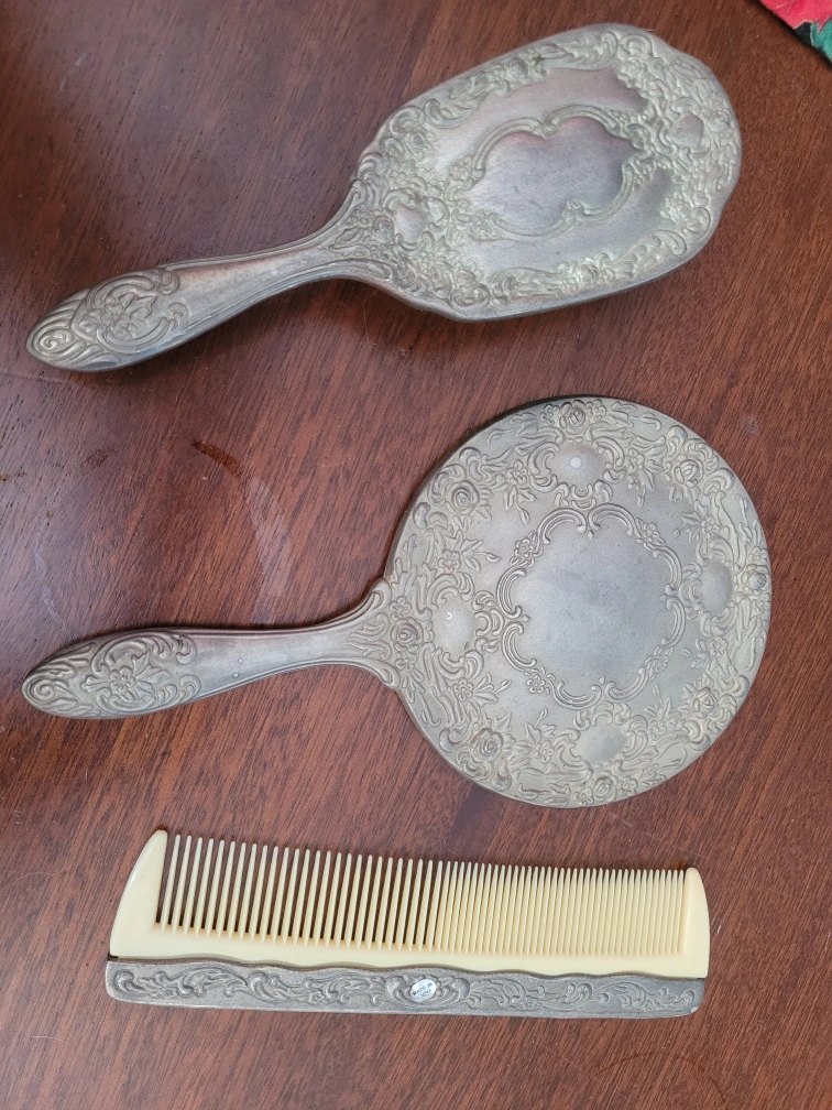Ornate silver-toned vanity set. Includes hand mirror, hairbrush, and comb. Perfect for vintage collectors or adding a touch of old-world charm to your boudoir.