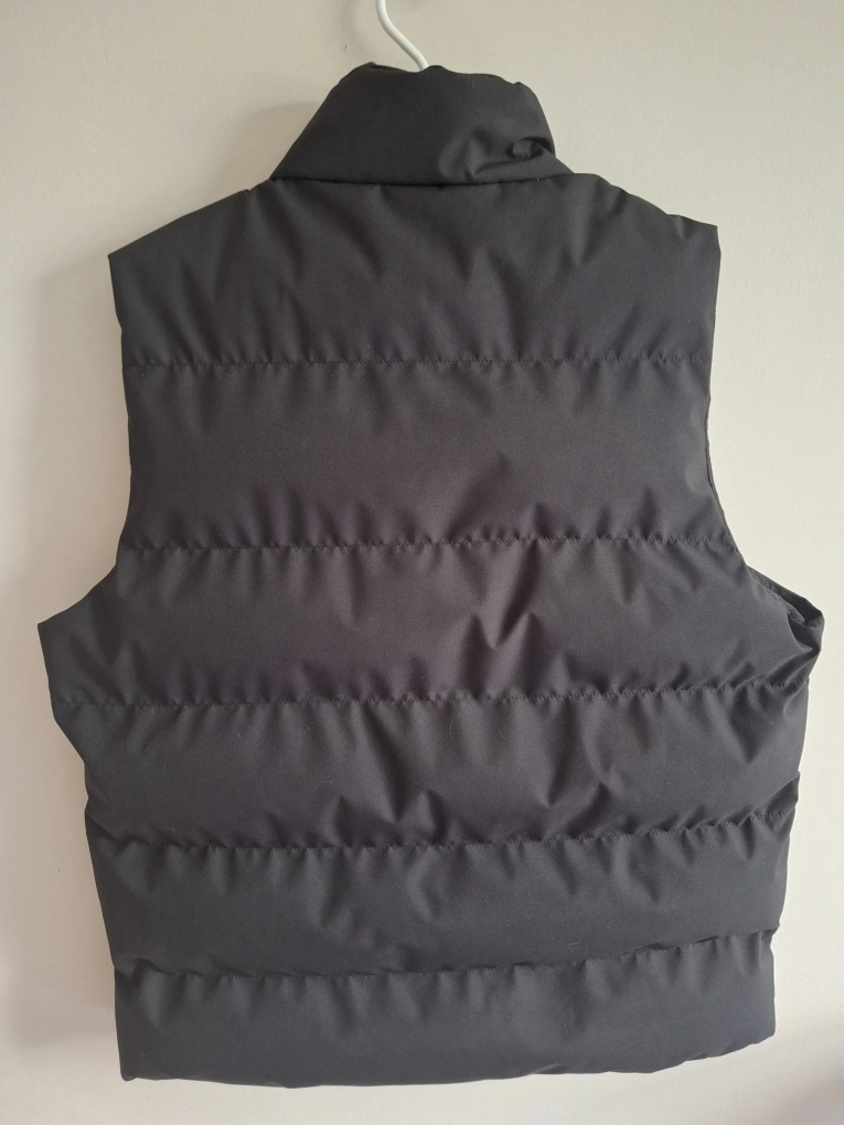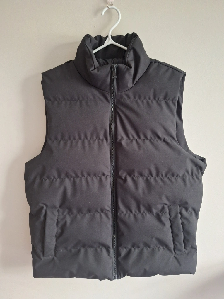 Unisex black puffer vest. Zipper closure. High collar. Two pockets. Warm and comfortable. Great for layering. This is a large, and also have a medium. May be able to get other sizes. Can go as low as $25.