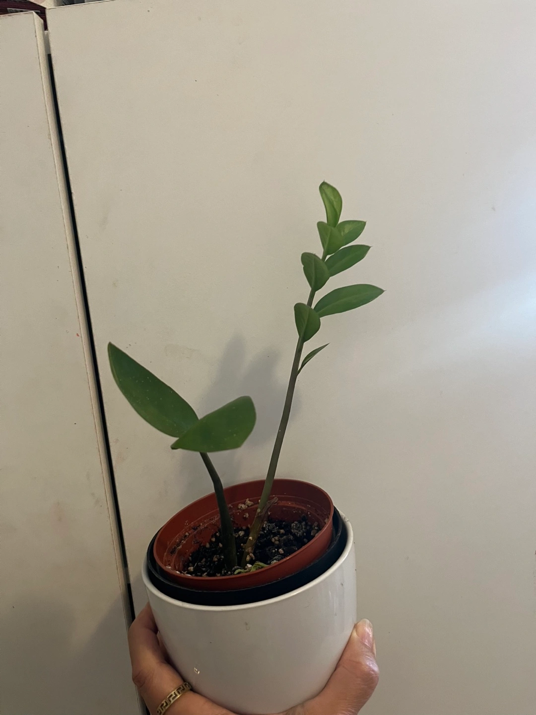 Two small Zamioculcas zamiifolia plants in a white pot. Planted in brown nursery pots. Great for a beginner. Fastest pick up preferred
