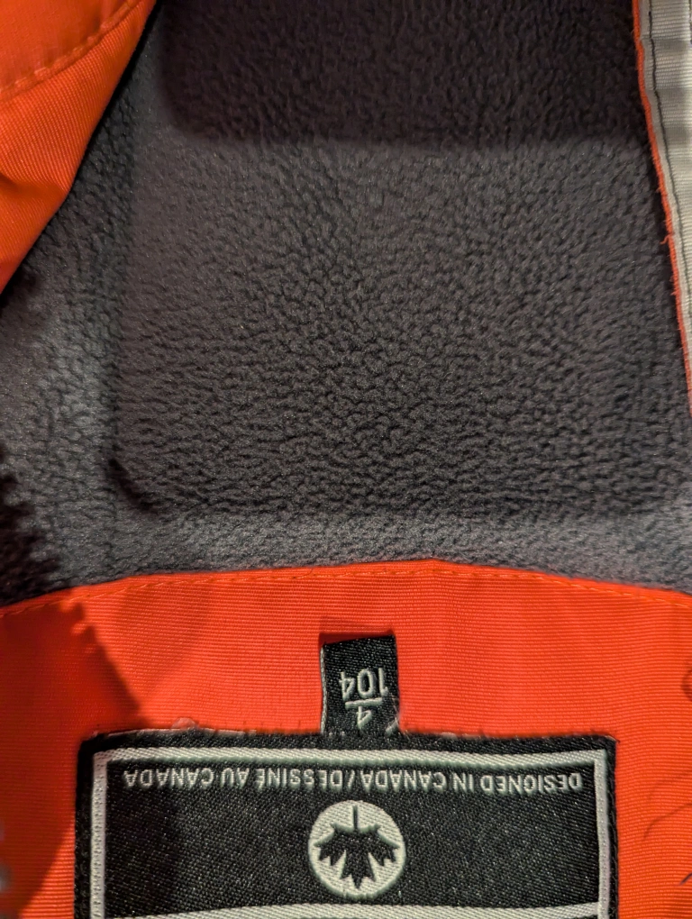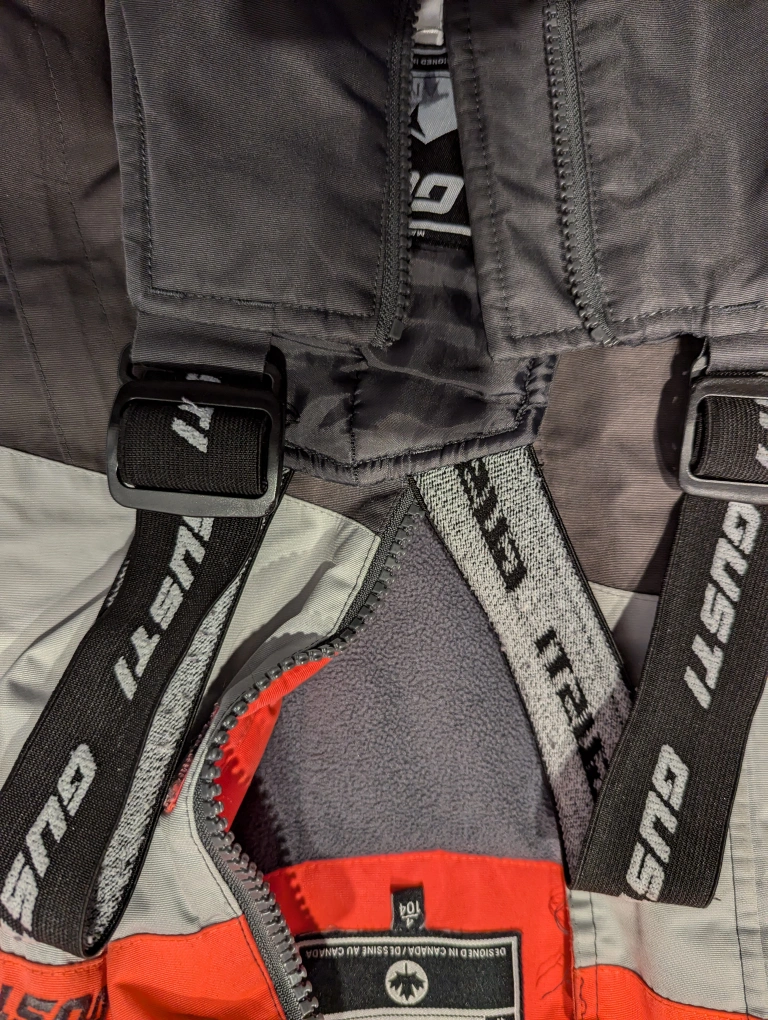 GUSTI snowsuit, size 4. Hot pink, dark grey, and light grey colour block design. Jacket and bib pants. Minor damage to pants (see last pic). 🚭 Smoke / Pet Free Home 🏡
