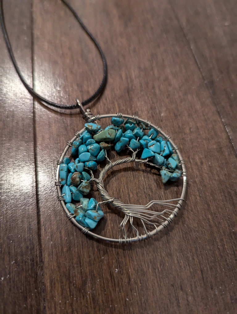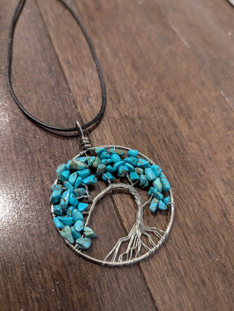 Unique necklace featuring a silver wire tree of life design accented with turquoise stones. Black cord necklace, the metal part of the cord came off, but should be an easy fix. Beautiful statement piece. ๐ญ Smoke / Pet Free Home ๐ก