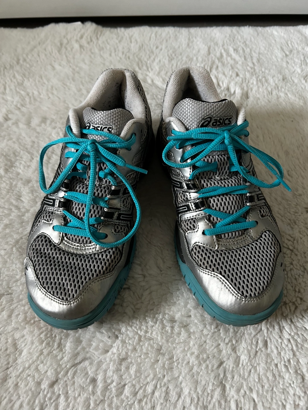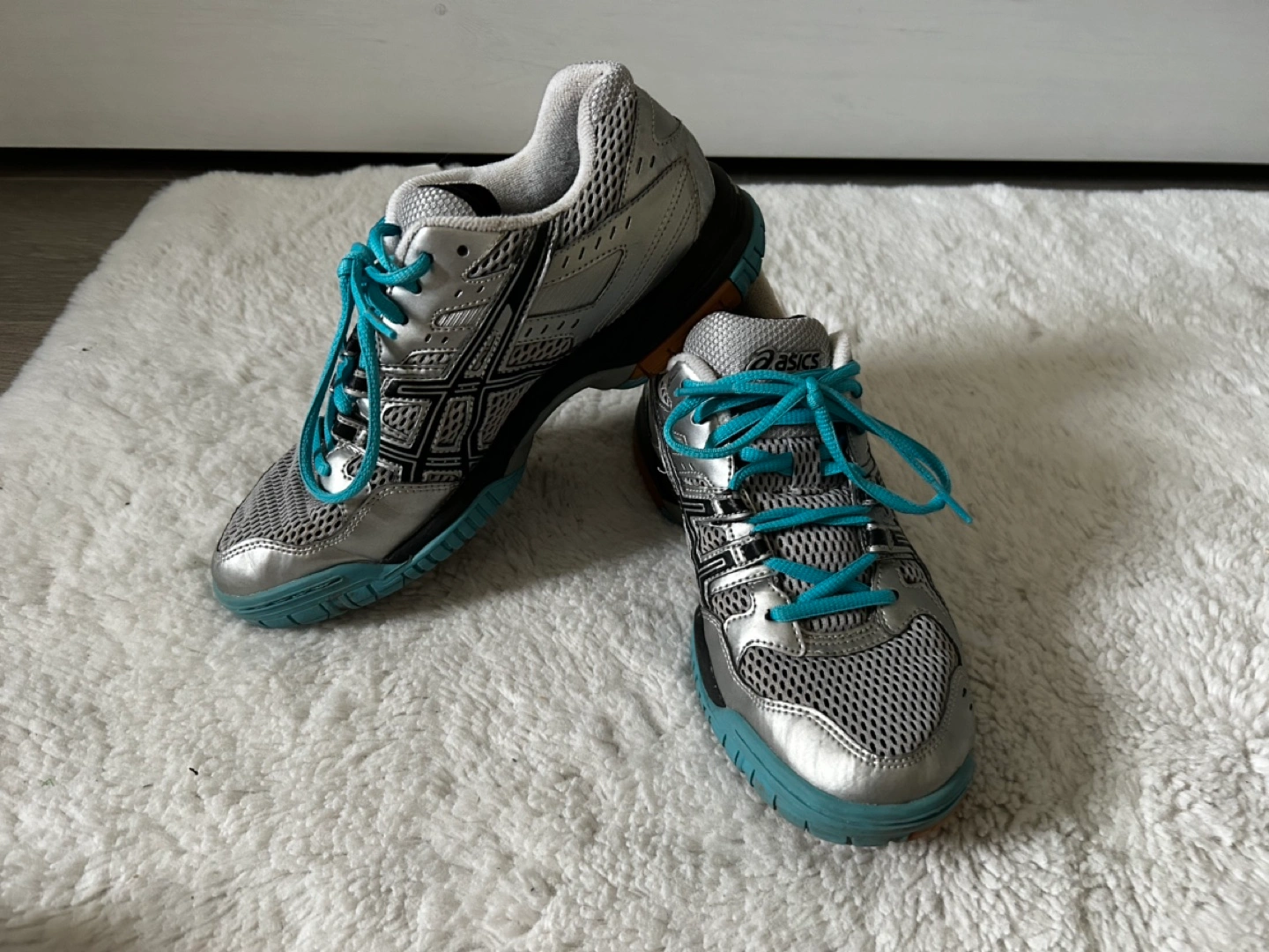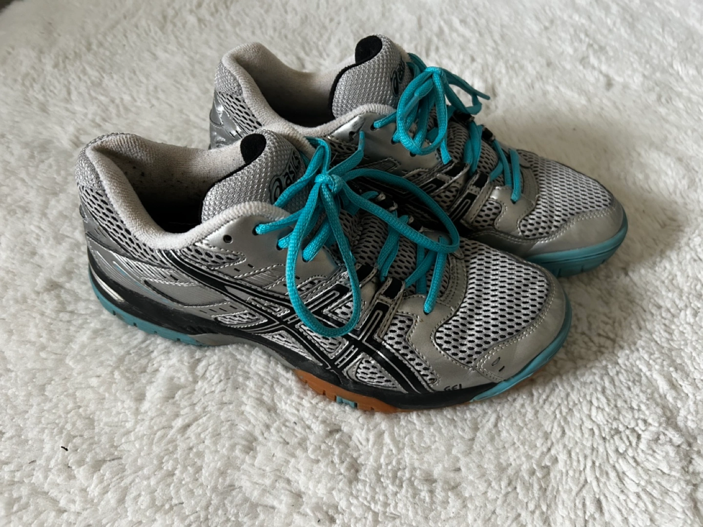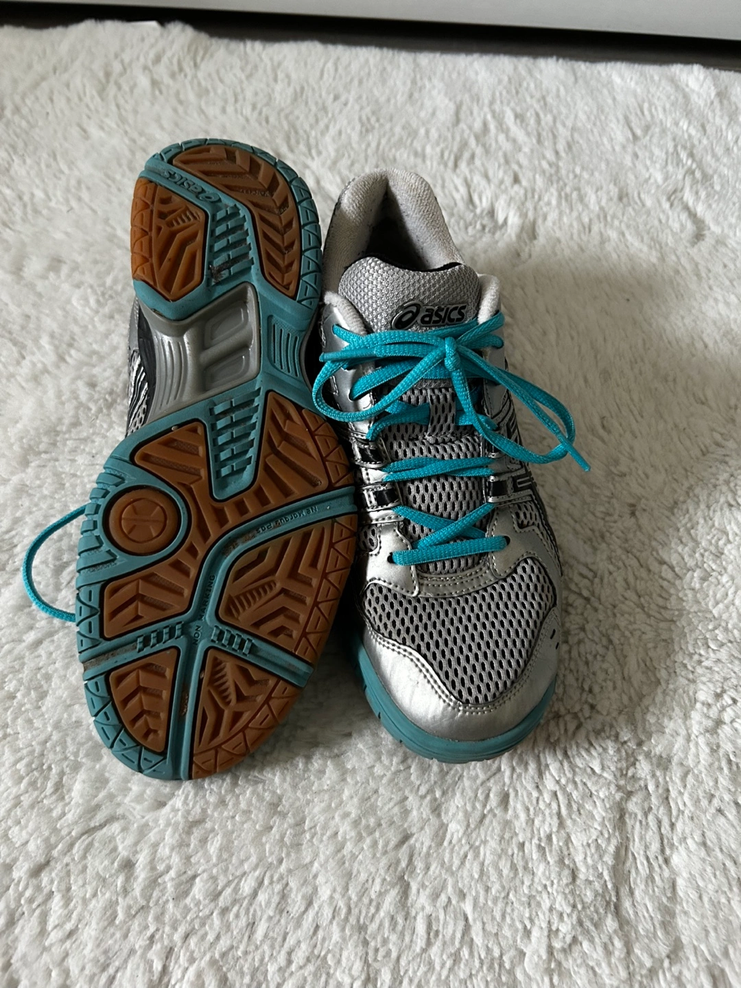 Women's volleyball shoes. Silver and teal colour scheme. Good condition. Lace-up closure. Durable soles.