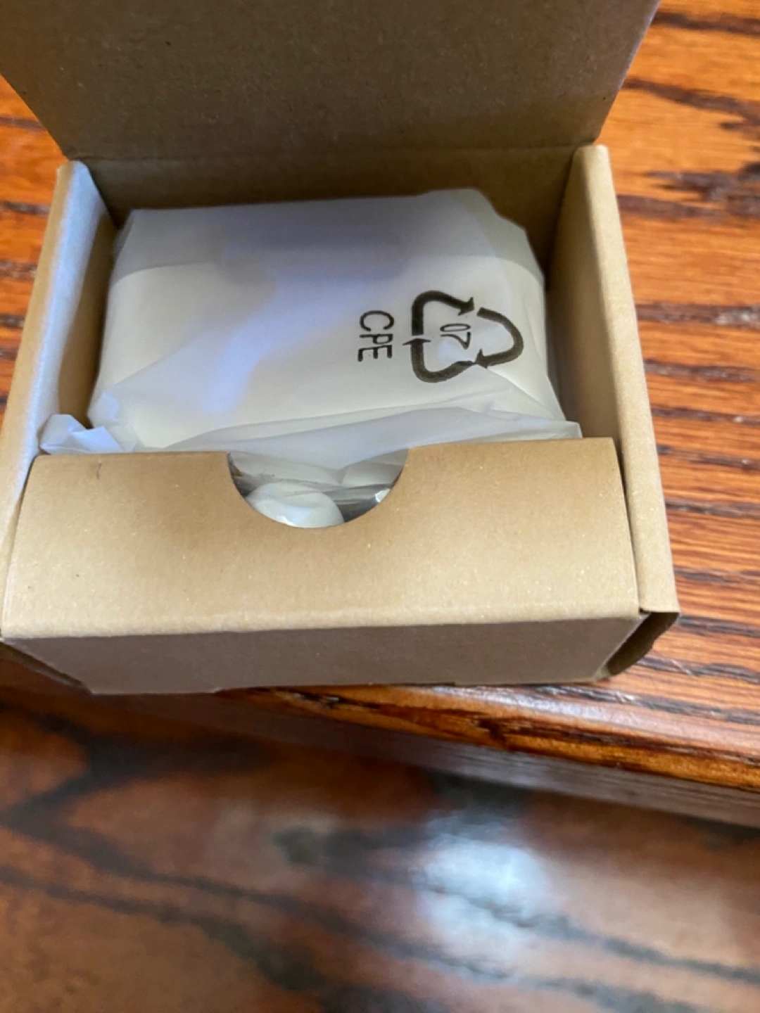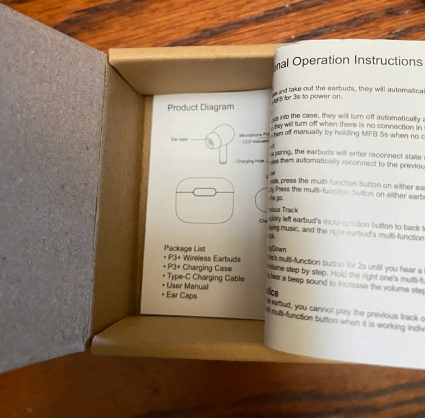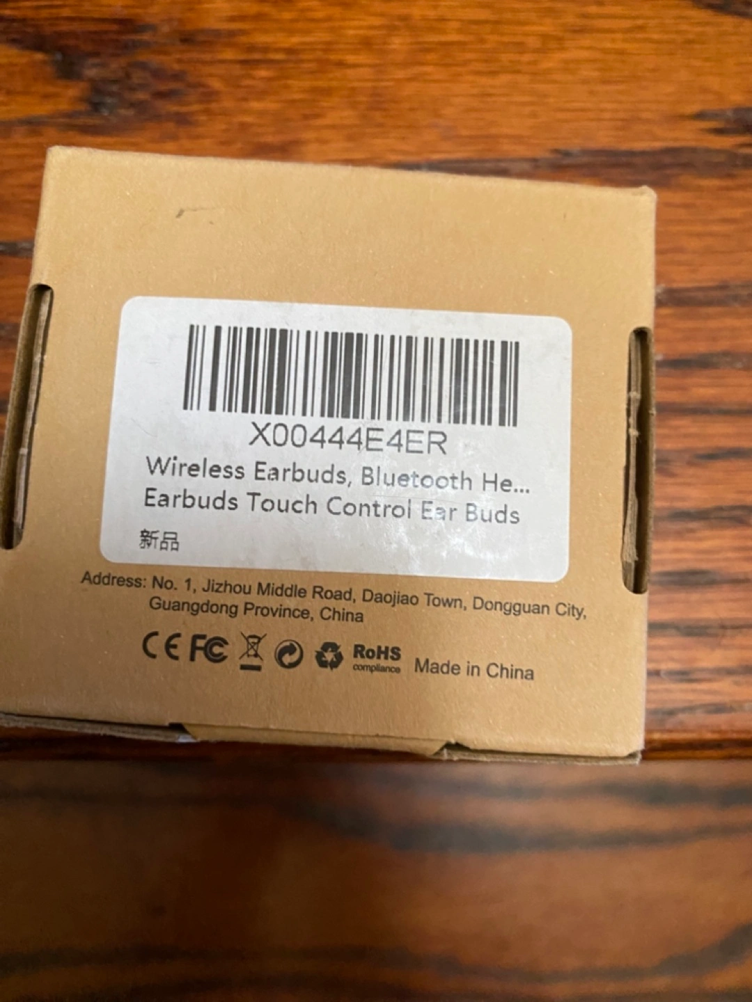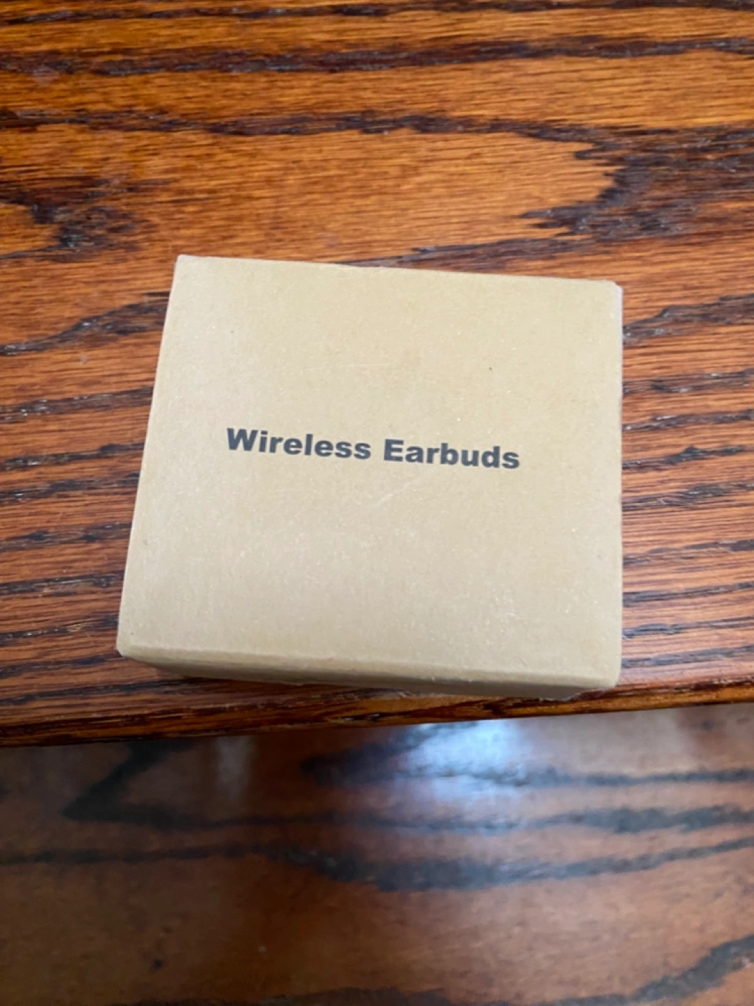 Wireless earbuds with touch controls. Bluetooth enabled. Includes charging case and instruction manual. Earbuds are white. Cash only