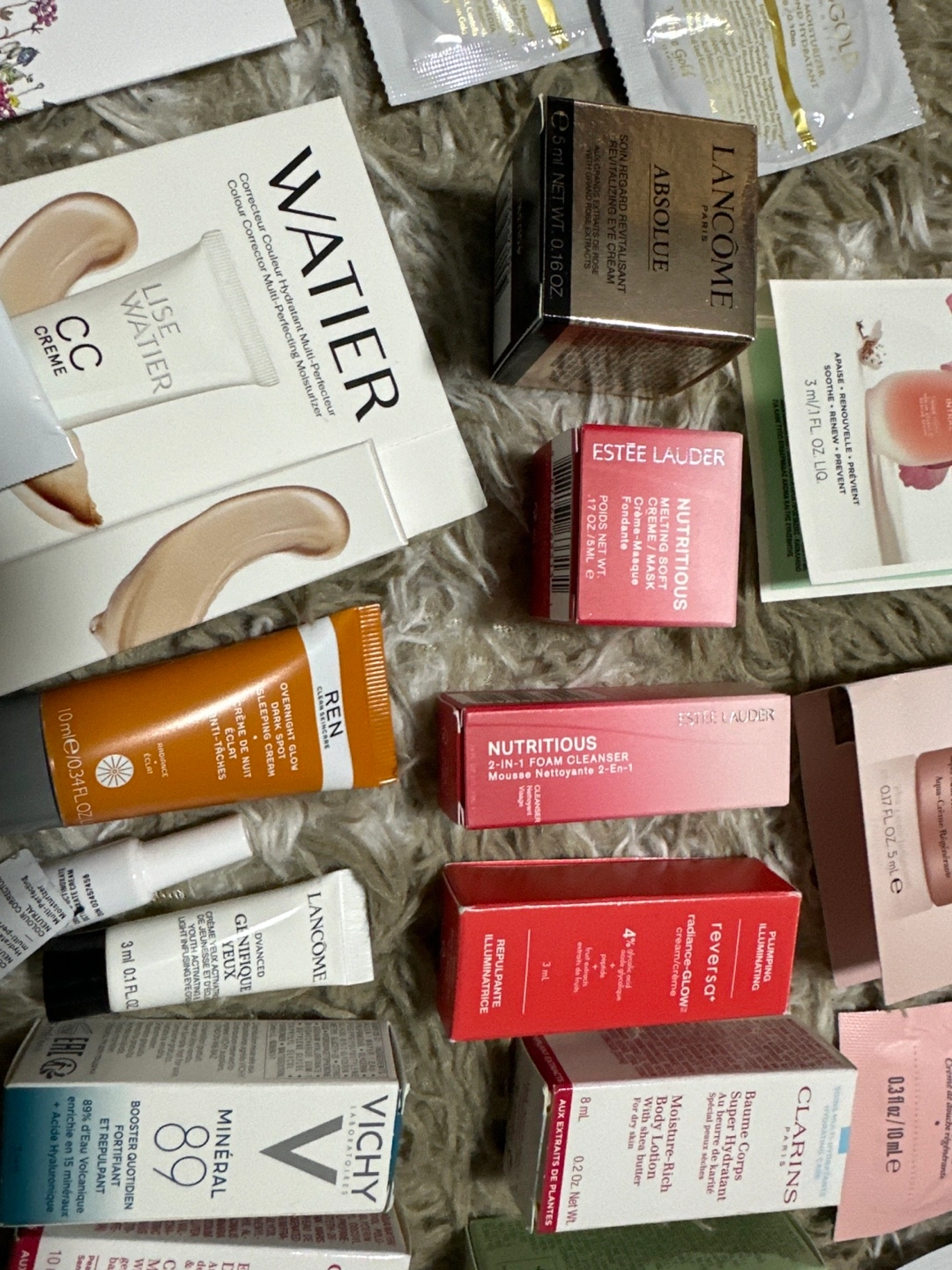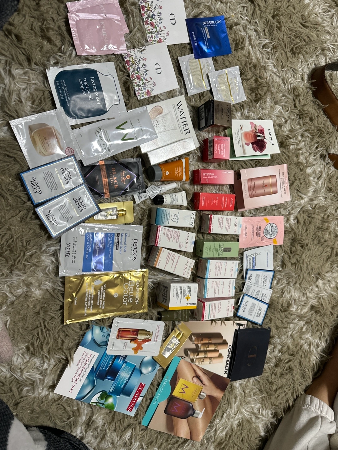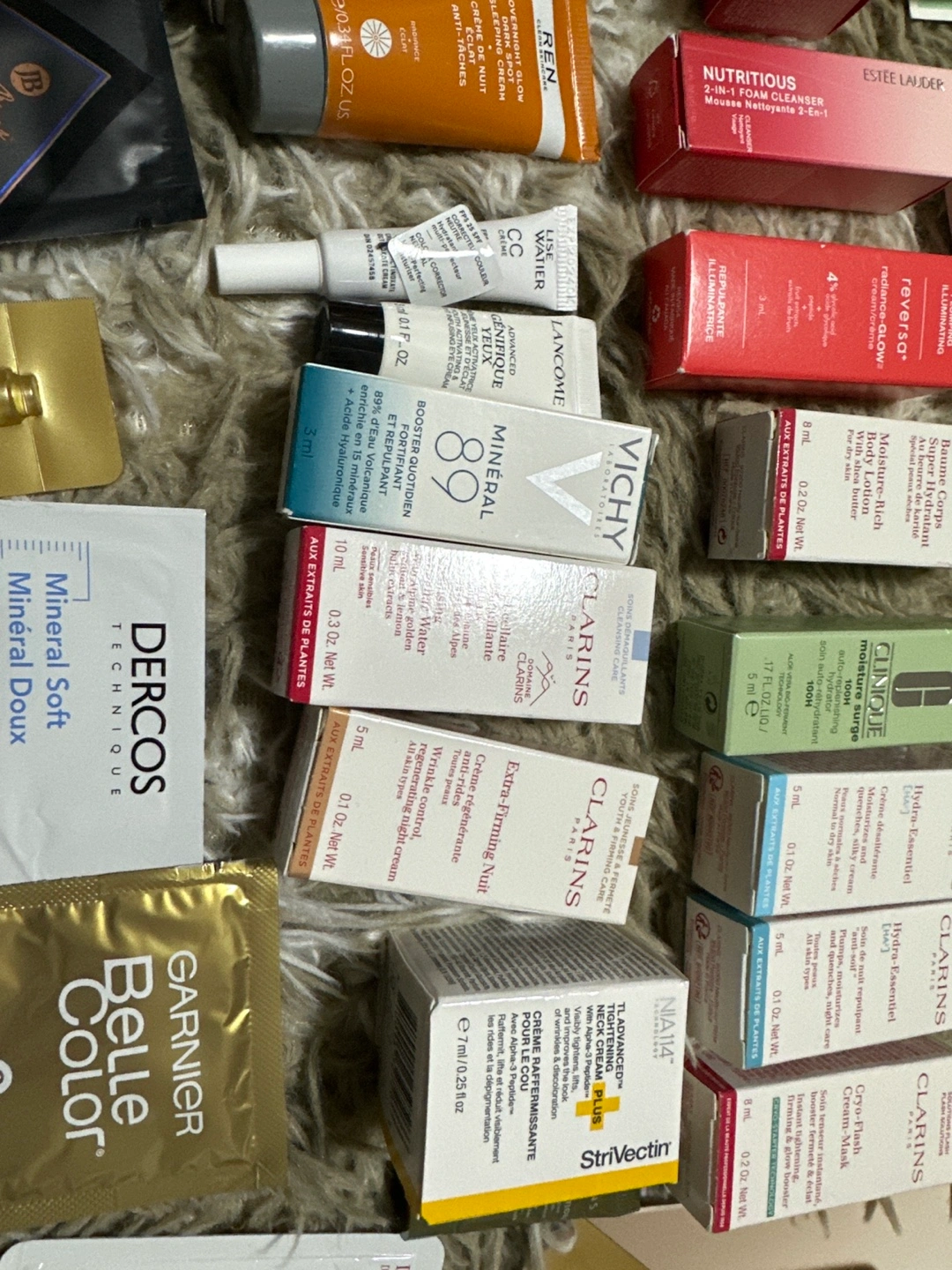 Large collection of skincare samples. Includes various brands and product types. Perfect for trying new products or travelling. Many unopened samples.
