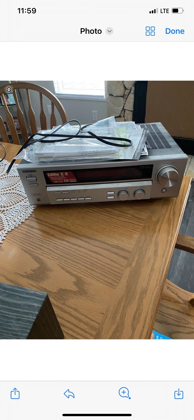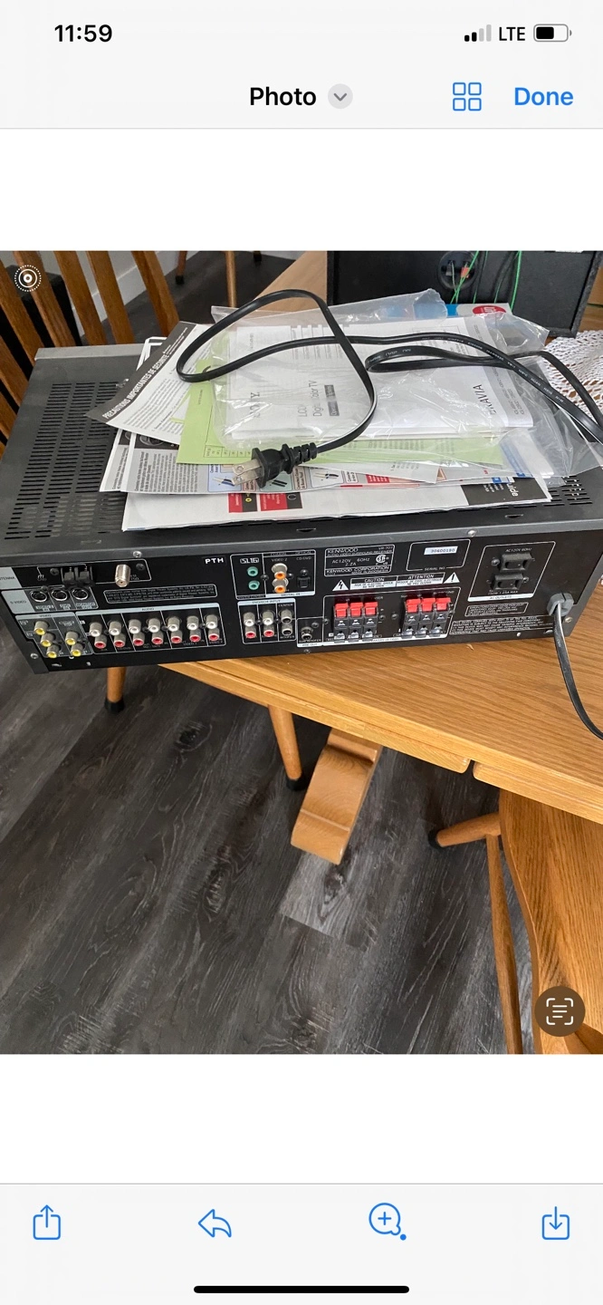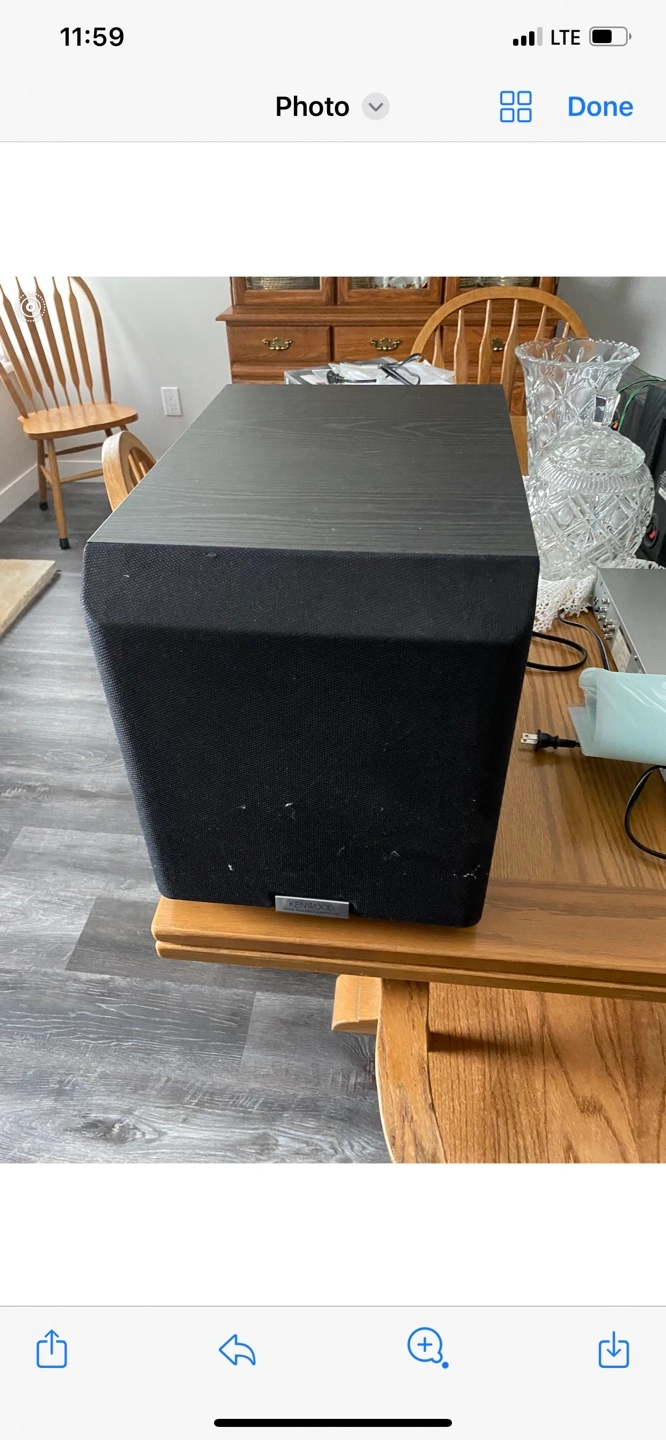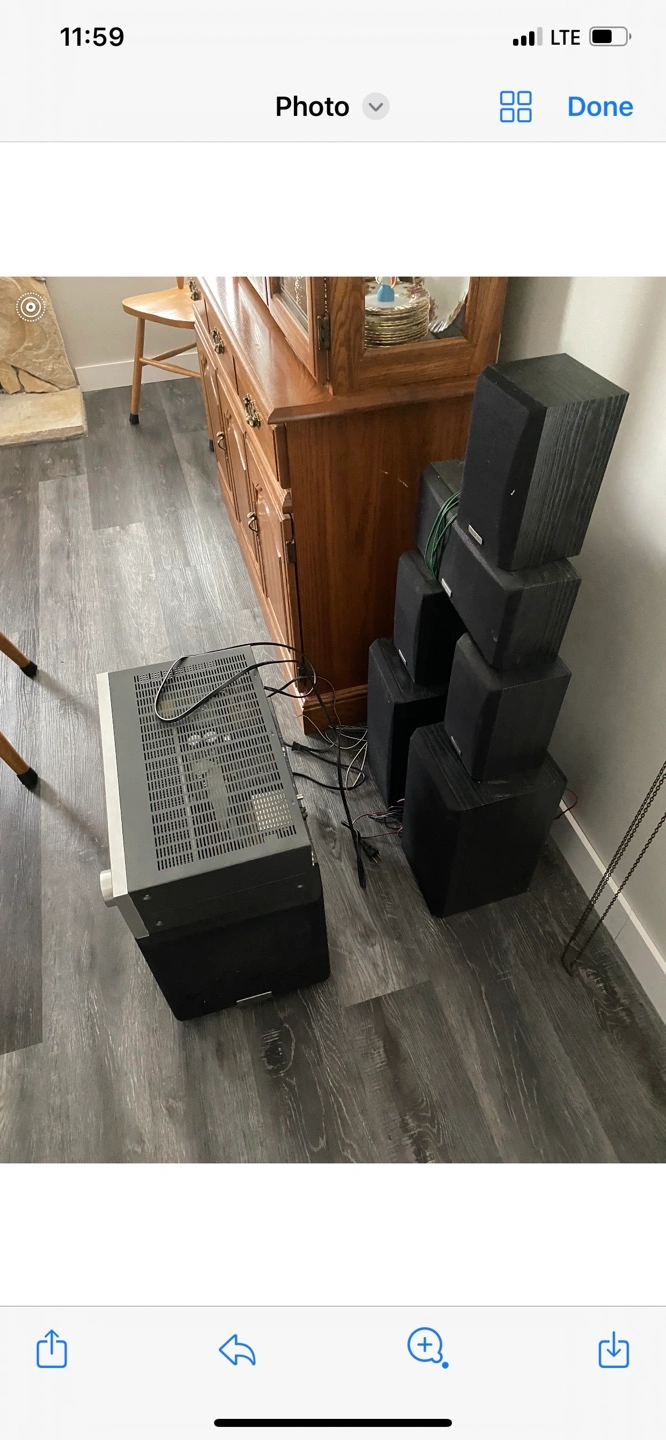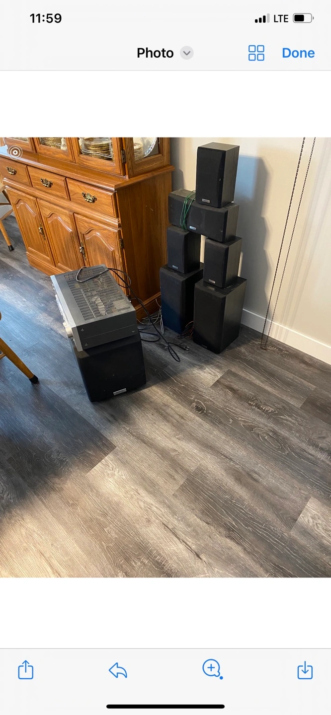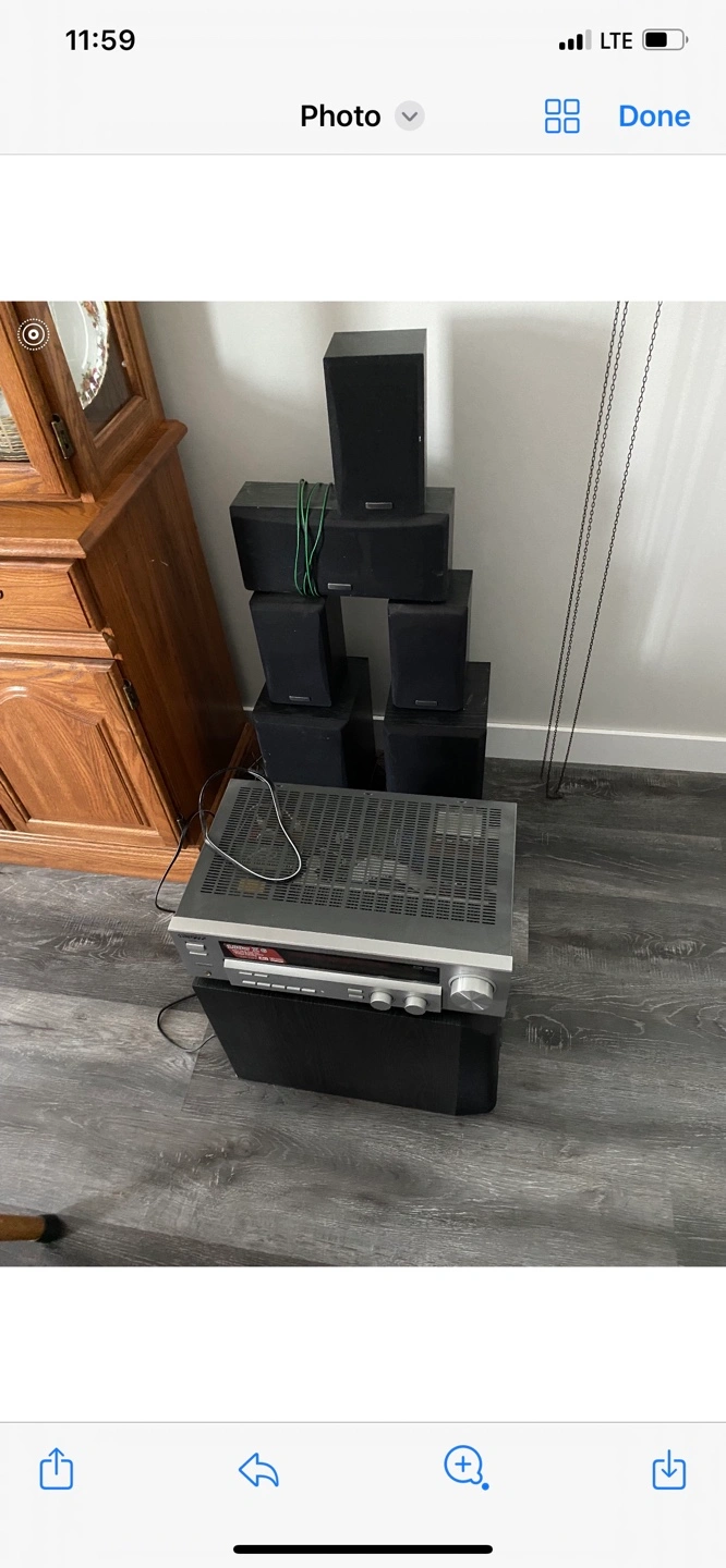 Home theatre system includes receiver, subwoofer, and five speakers. Great sound quality, well-maintained.