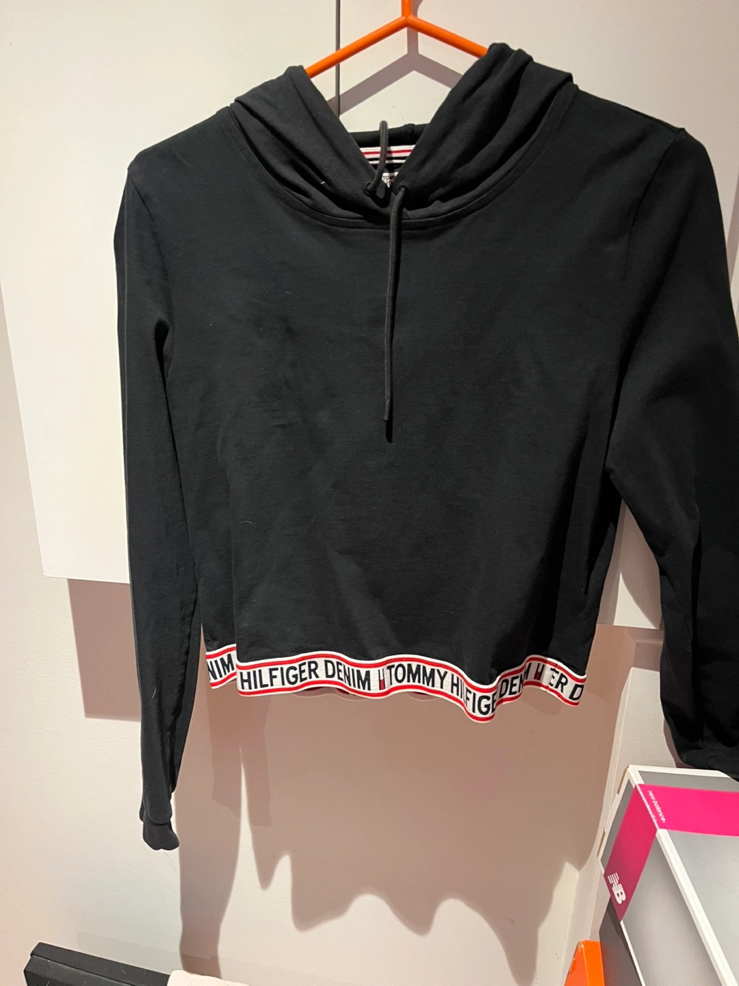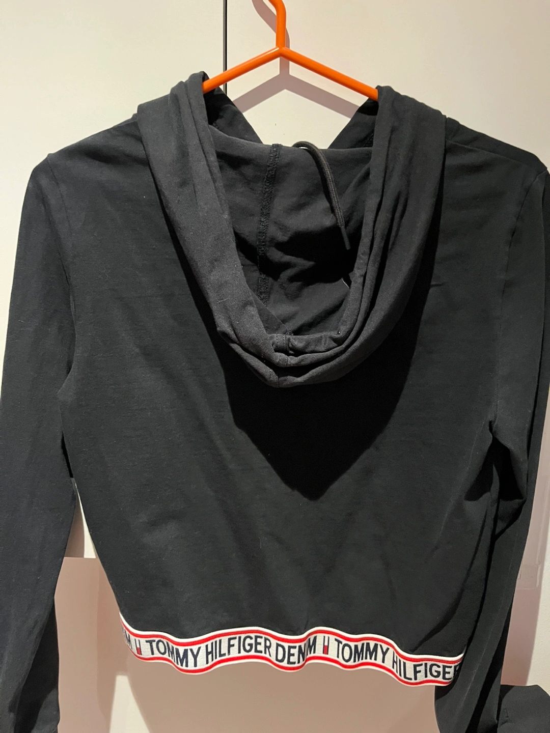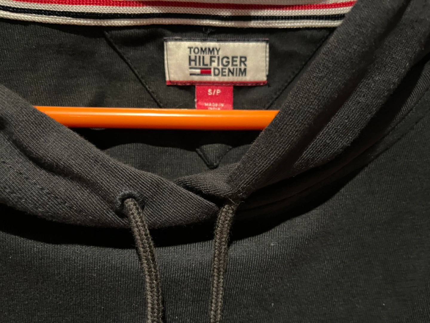 Black Tommy Hilfiger Denim hoodie. Size small/petite. Features Tommy Hilfiger Denim branding at the hem and a drawstring hood.