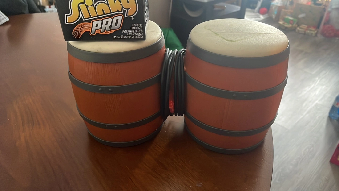 Pair of Donkey Konga bongo drums for the Nintendo Wii. Includes connecting cable. Pre-owned.