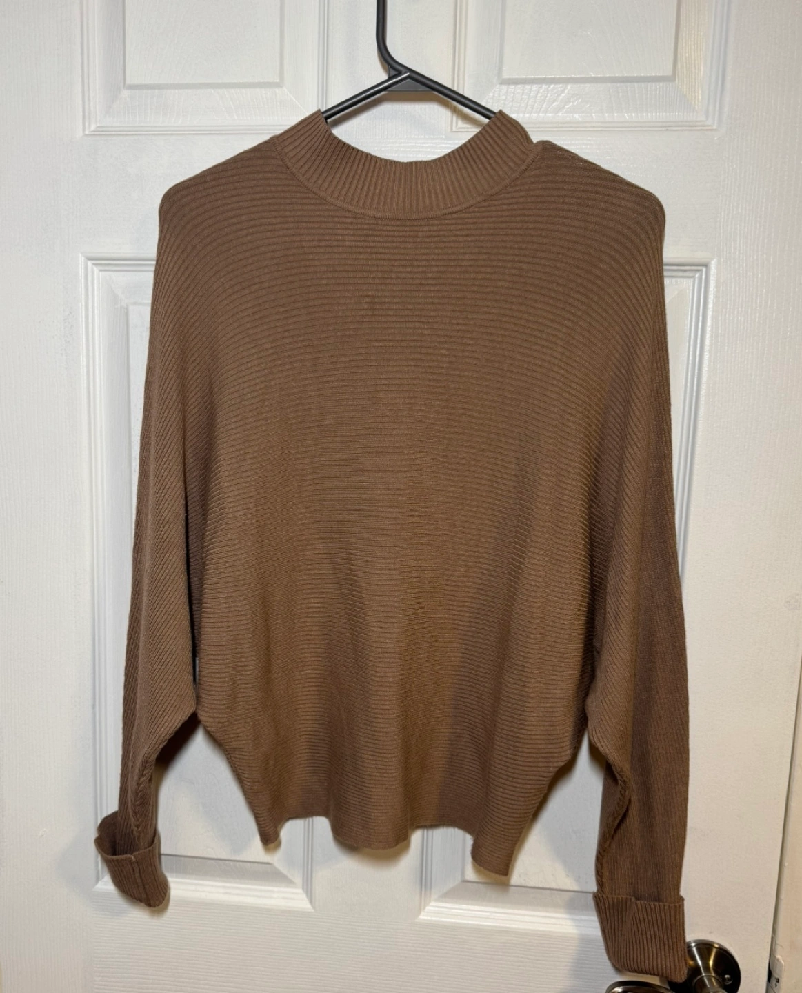 Brown oversized sweater, does sit like a crop top but you can adjust it Size- S I do have a cat so cat fur may be visible