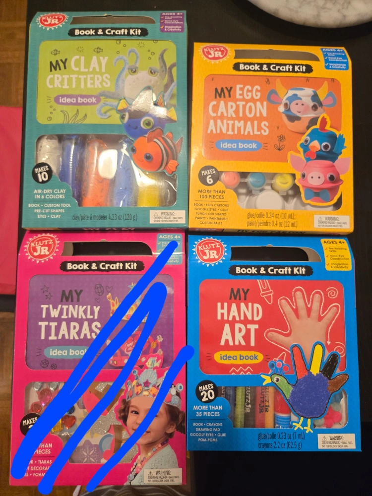 Klutz Jr. craft kits. Includes My Clay Critters, My Egg Carton Animals, and My Hand Art. Each kit contains materials and instructions to create fun crafts. $10 each. Brand new.