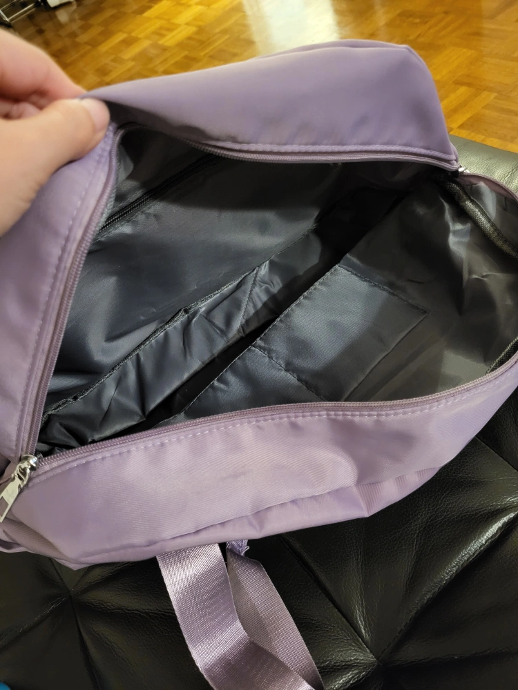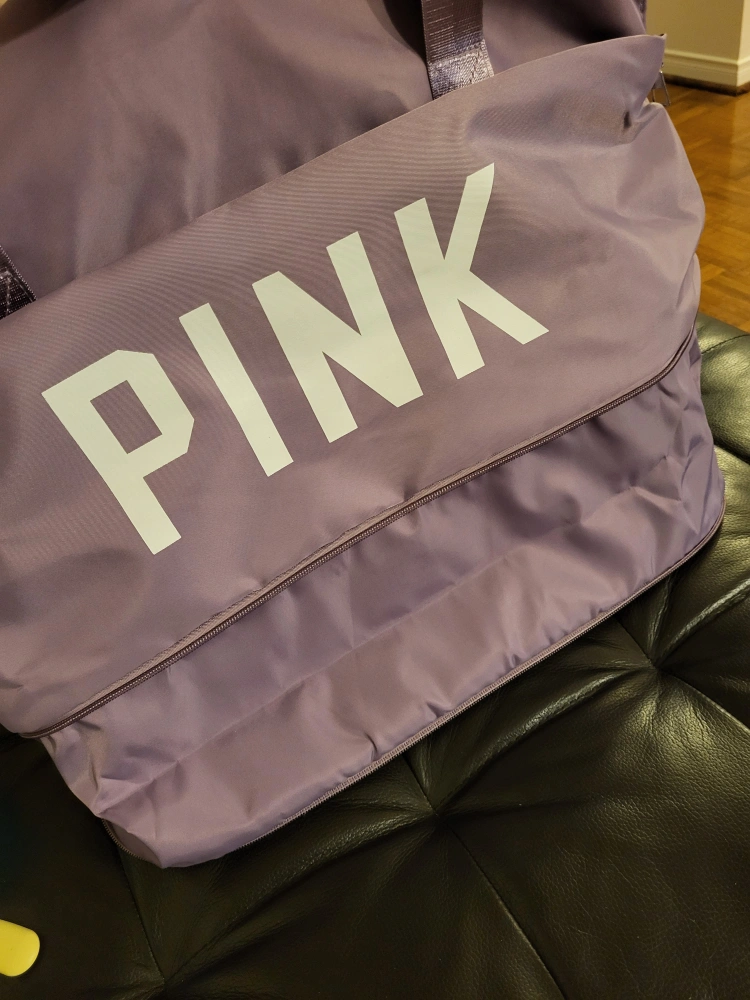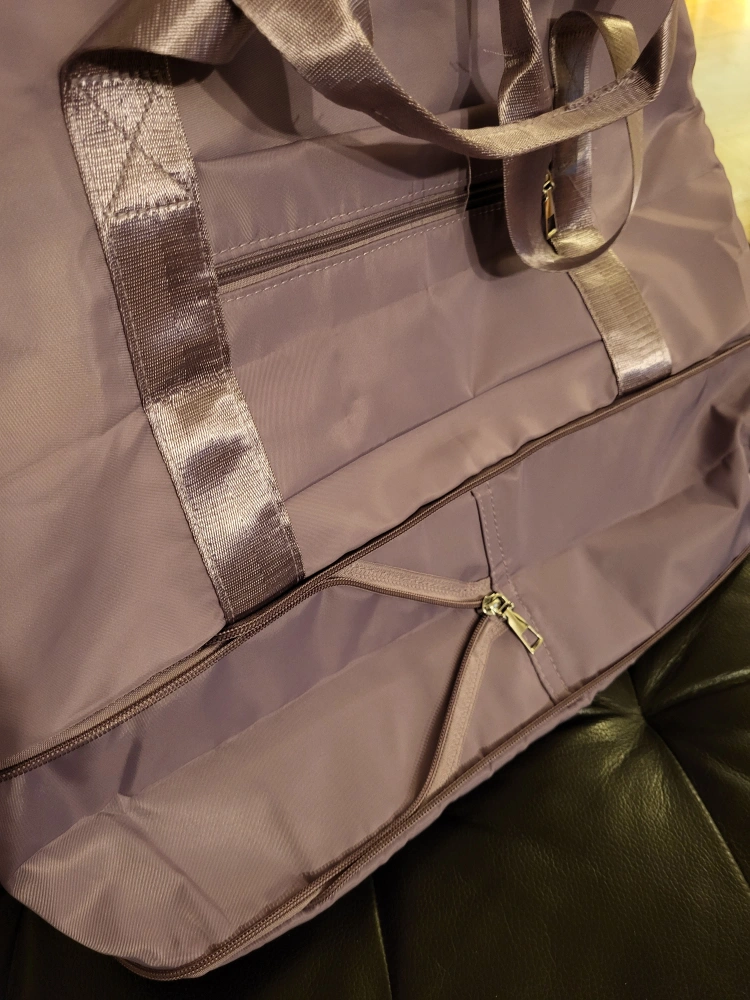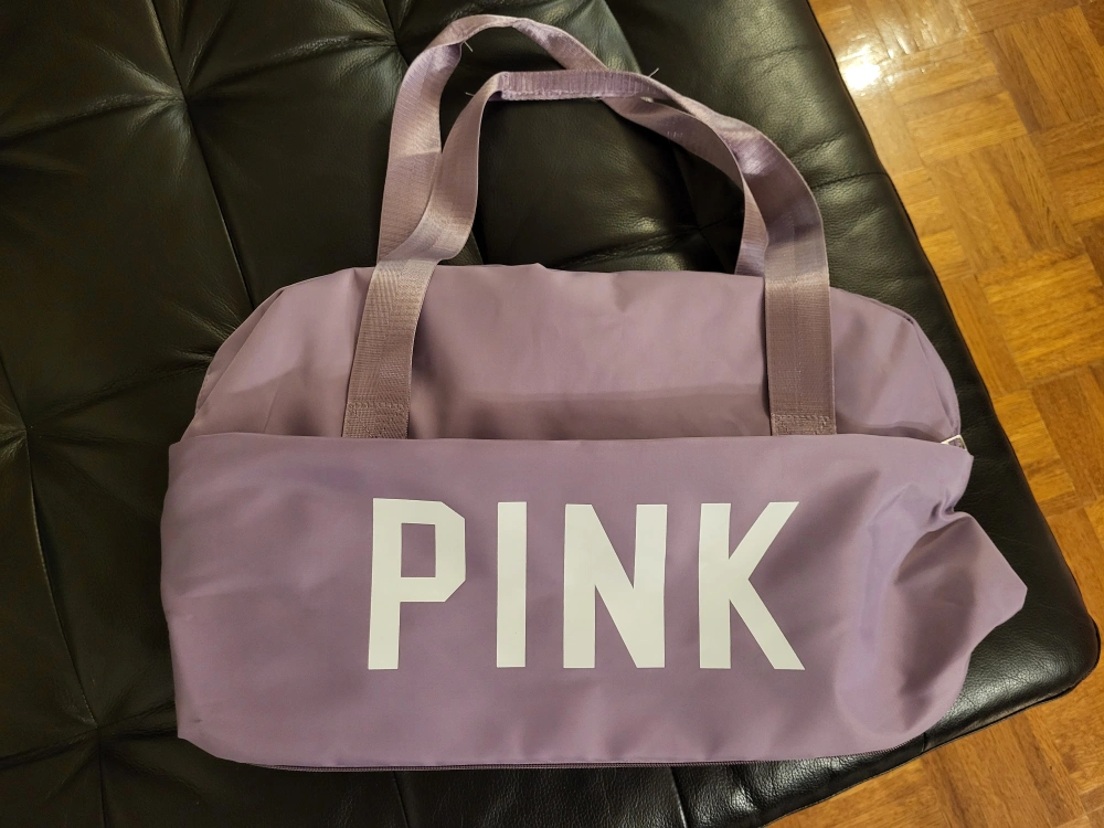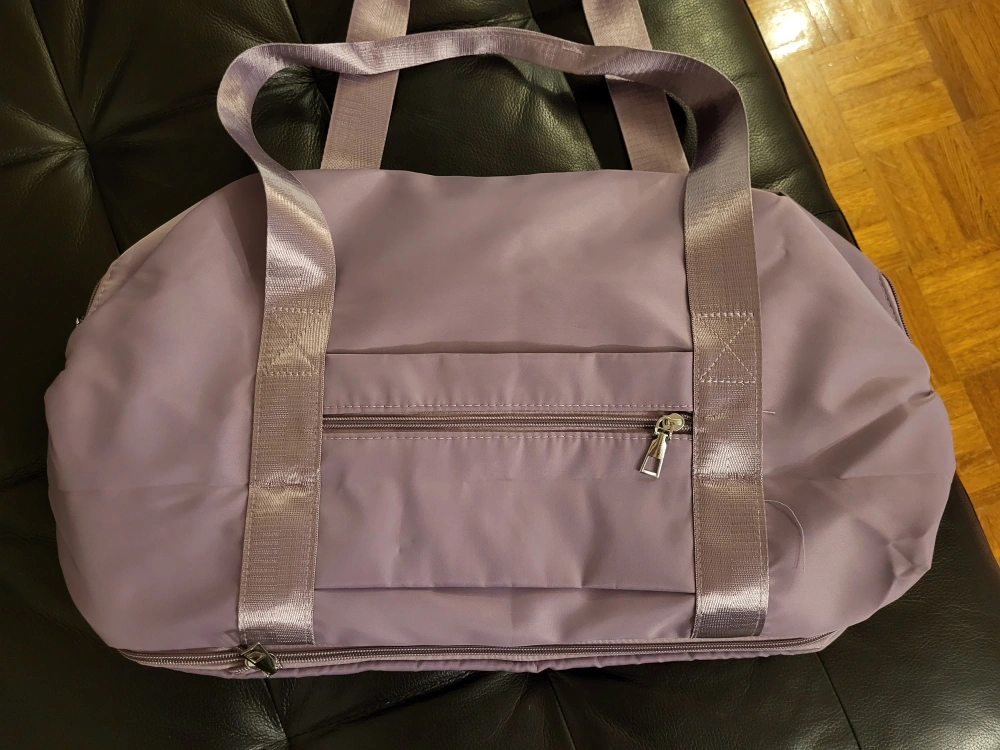 Lightweight purple duffle bag. Features two main zipper compartments and several smaller interior pockets. Expandable. Durable straps. Great for travel or the gym. Brand new. Never used.