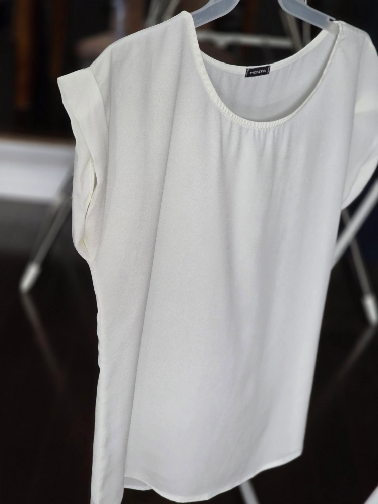 Cream-coloured women's blouse. Short sleeves. Round neckline. Lightweight material. Great for summer.