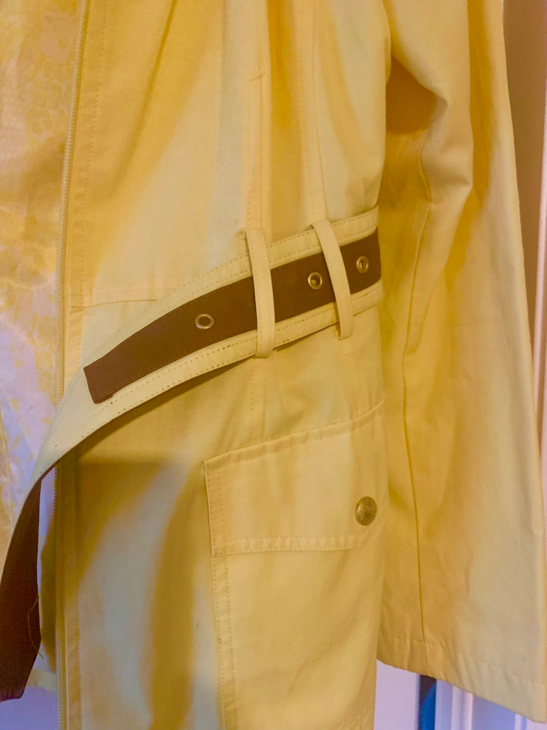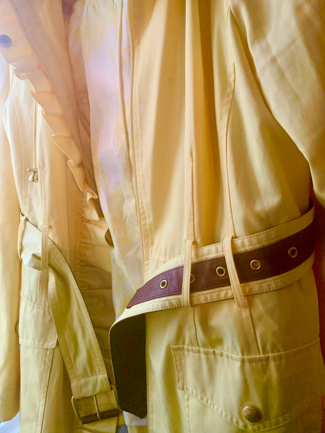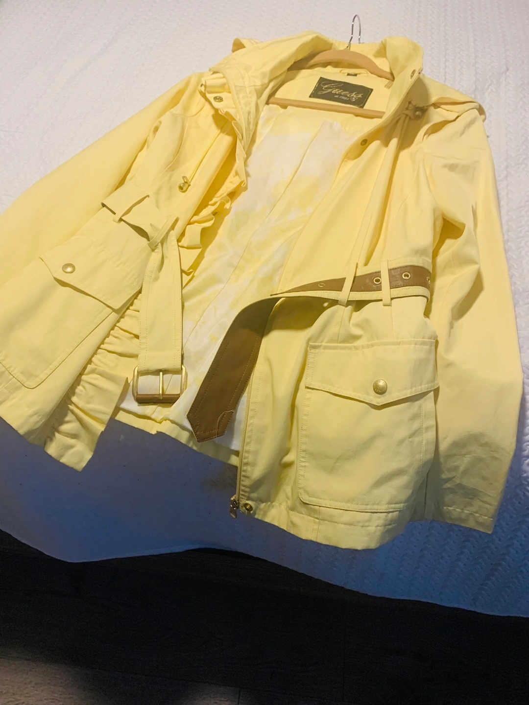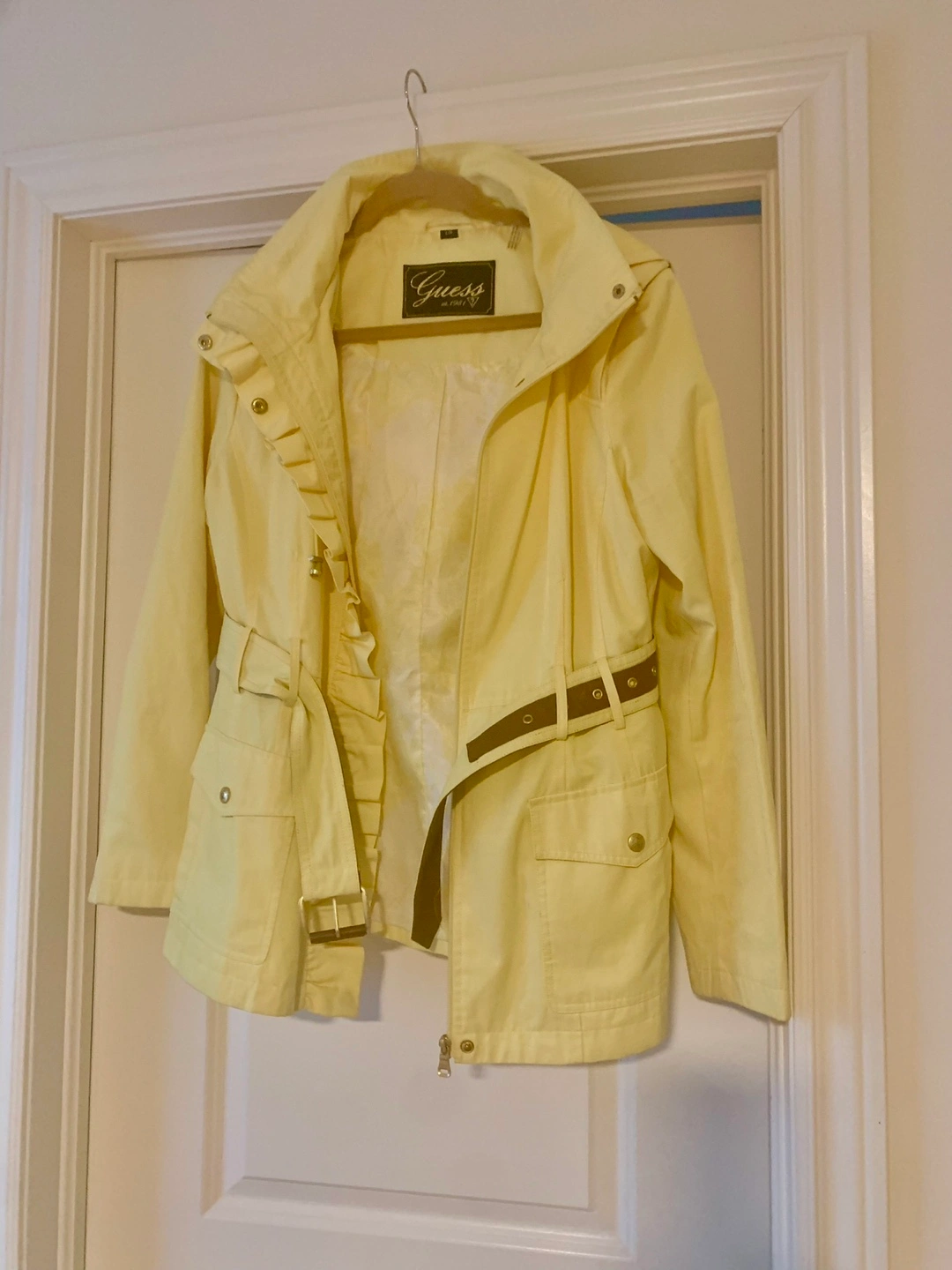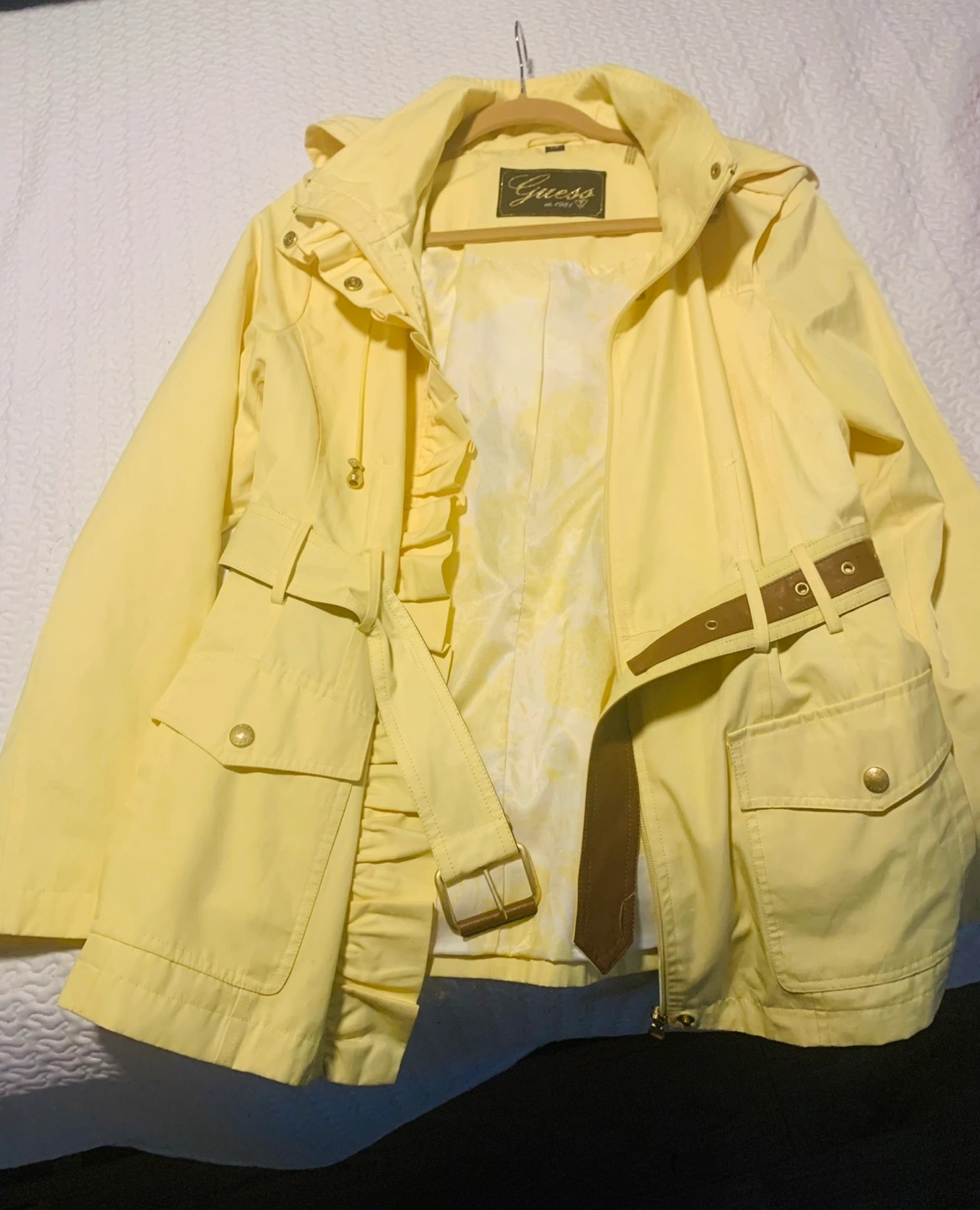 Women's yellow Guess trench coat. Features a detachable hood, ruffle detailing, and a brown leather belt. Multiple pockets. Zip and button closure.