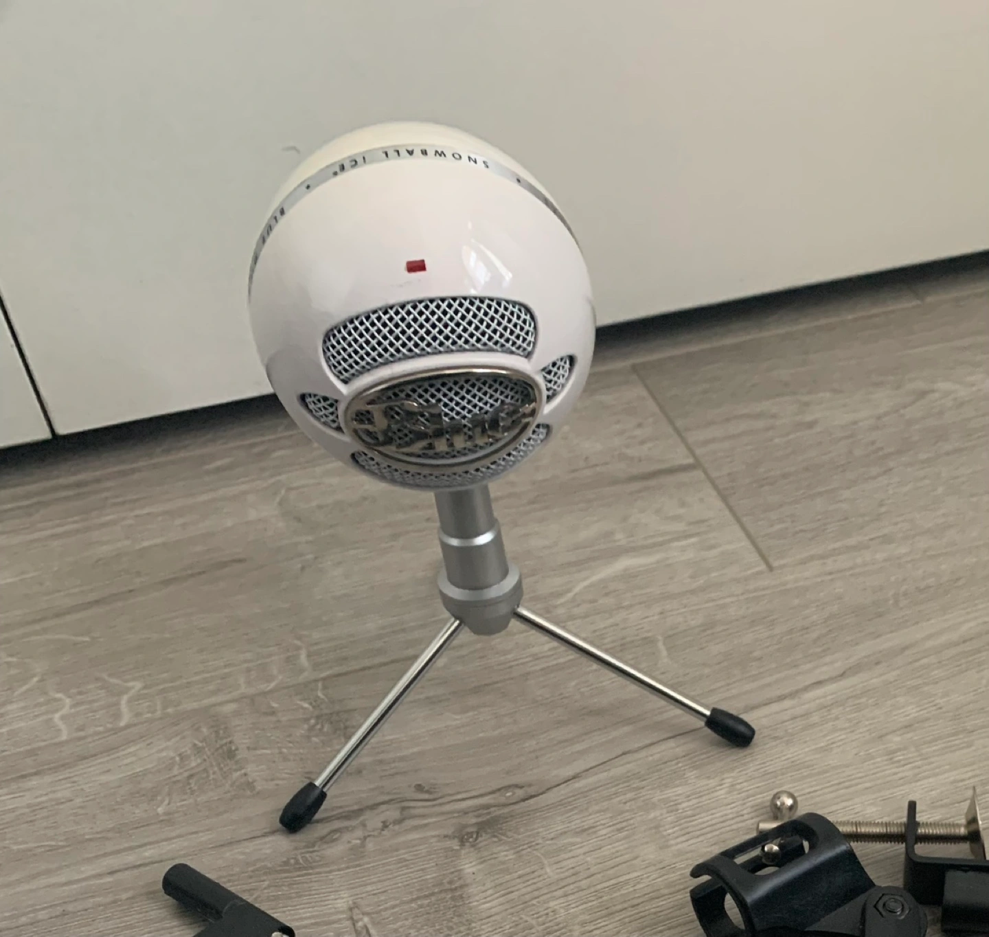 White USB microphone. Includes tripod stand. Great for podcasting or streaming.