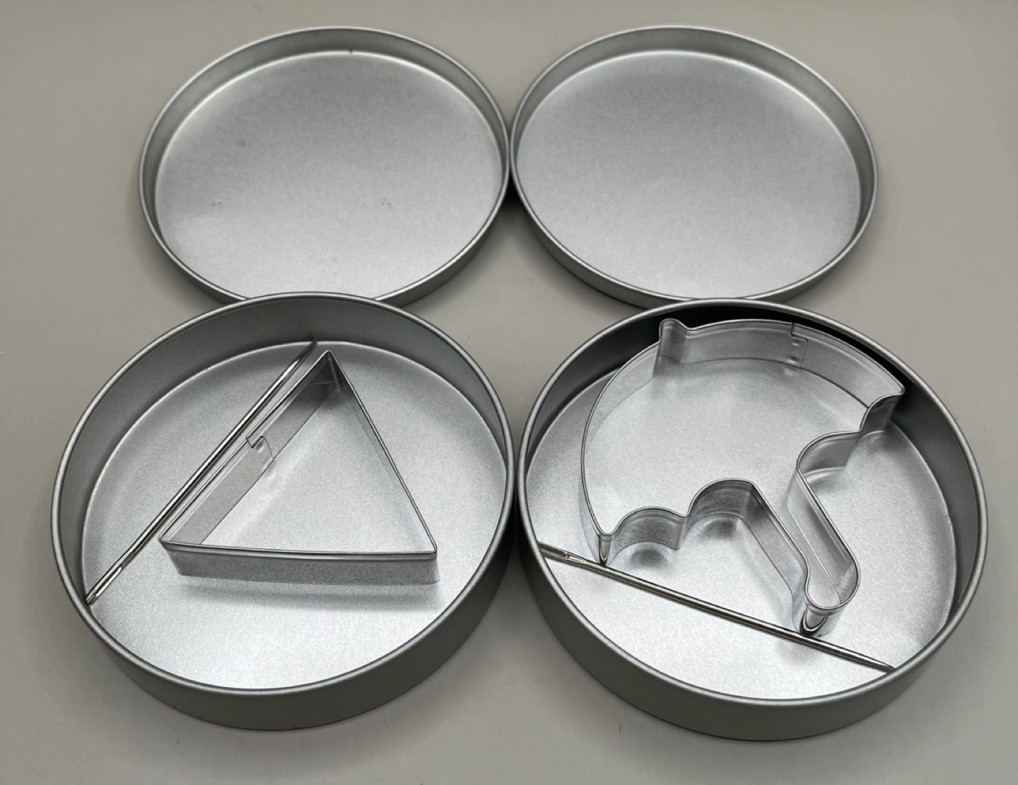 Set of vintage metal cookie cutters. Includes triangle and umbrella shapes. Comes in a silver tin storage container. Great for baking or crafting.