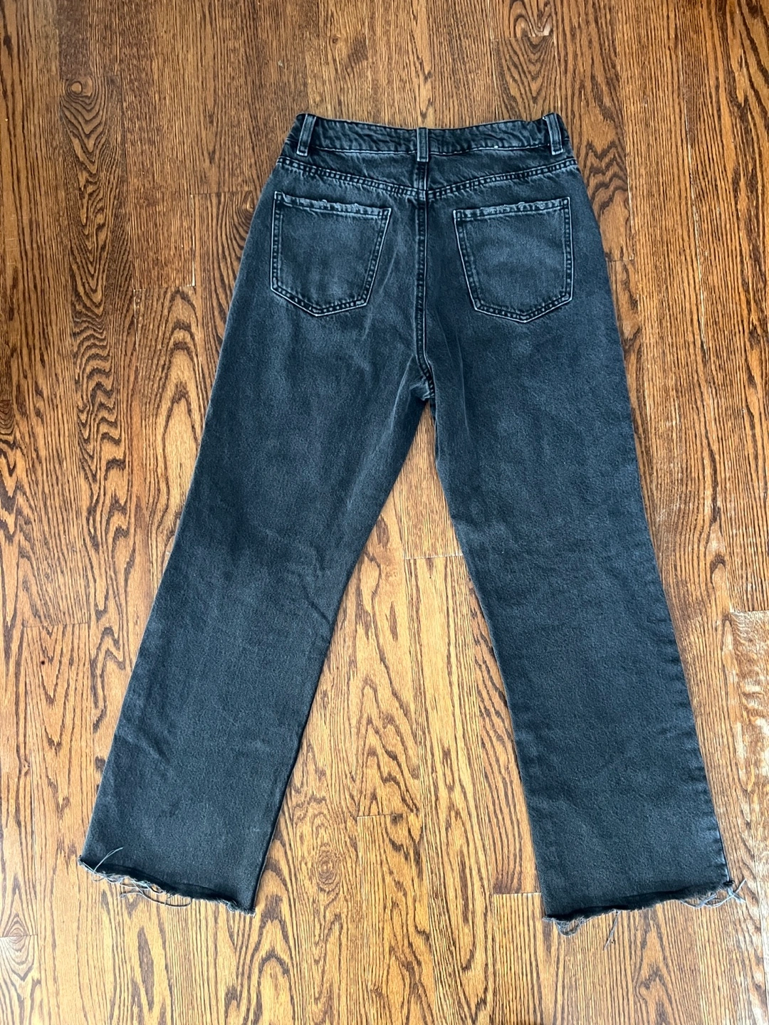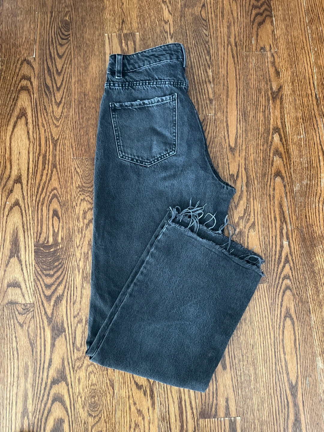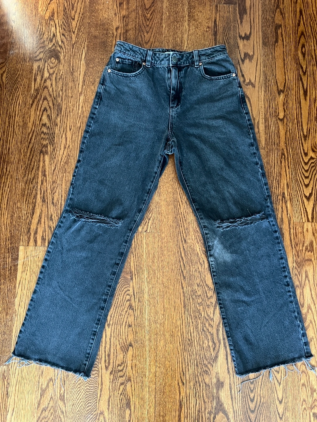 Dark distressed wash, straight leg jeans. Raw hem. Size 28.