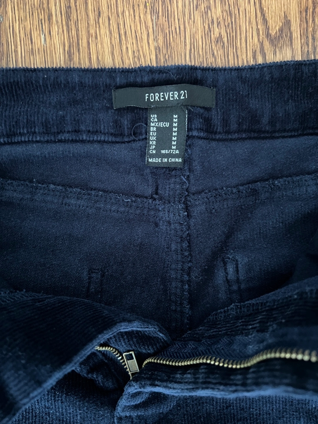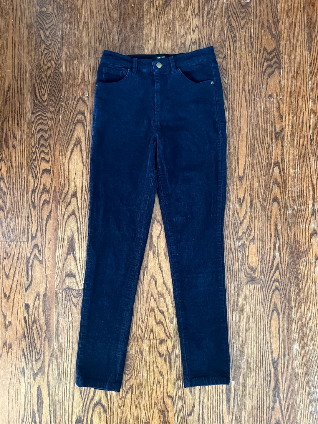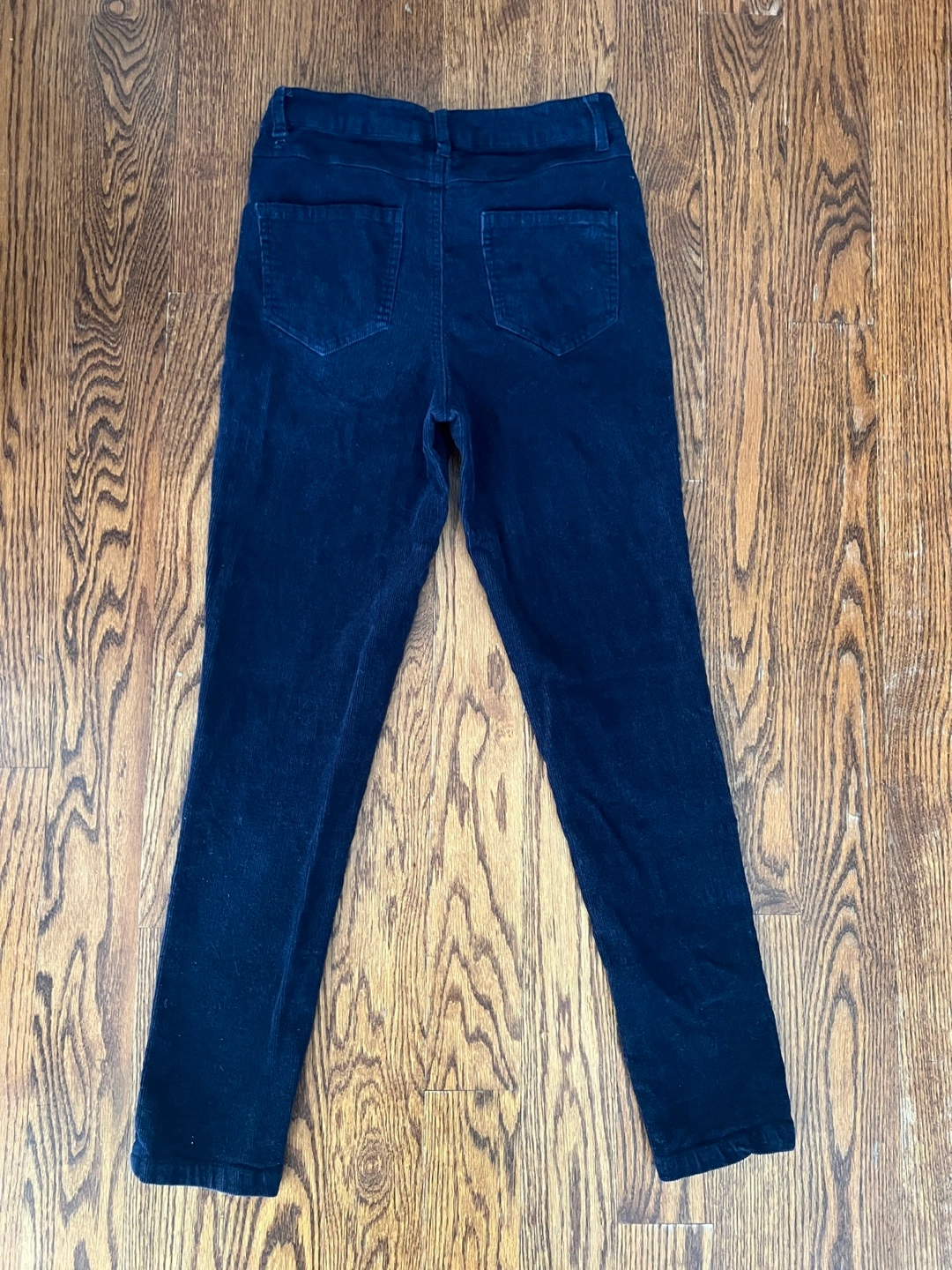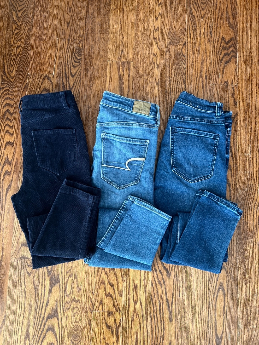 Bundle includes three pairs of jeans and one pair of navy corduroy pants. Sizes are medium, 6/7, Good condition. American Eagle, Garage, and Forever 21 brands included.
