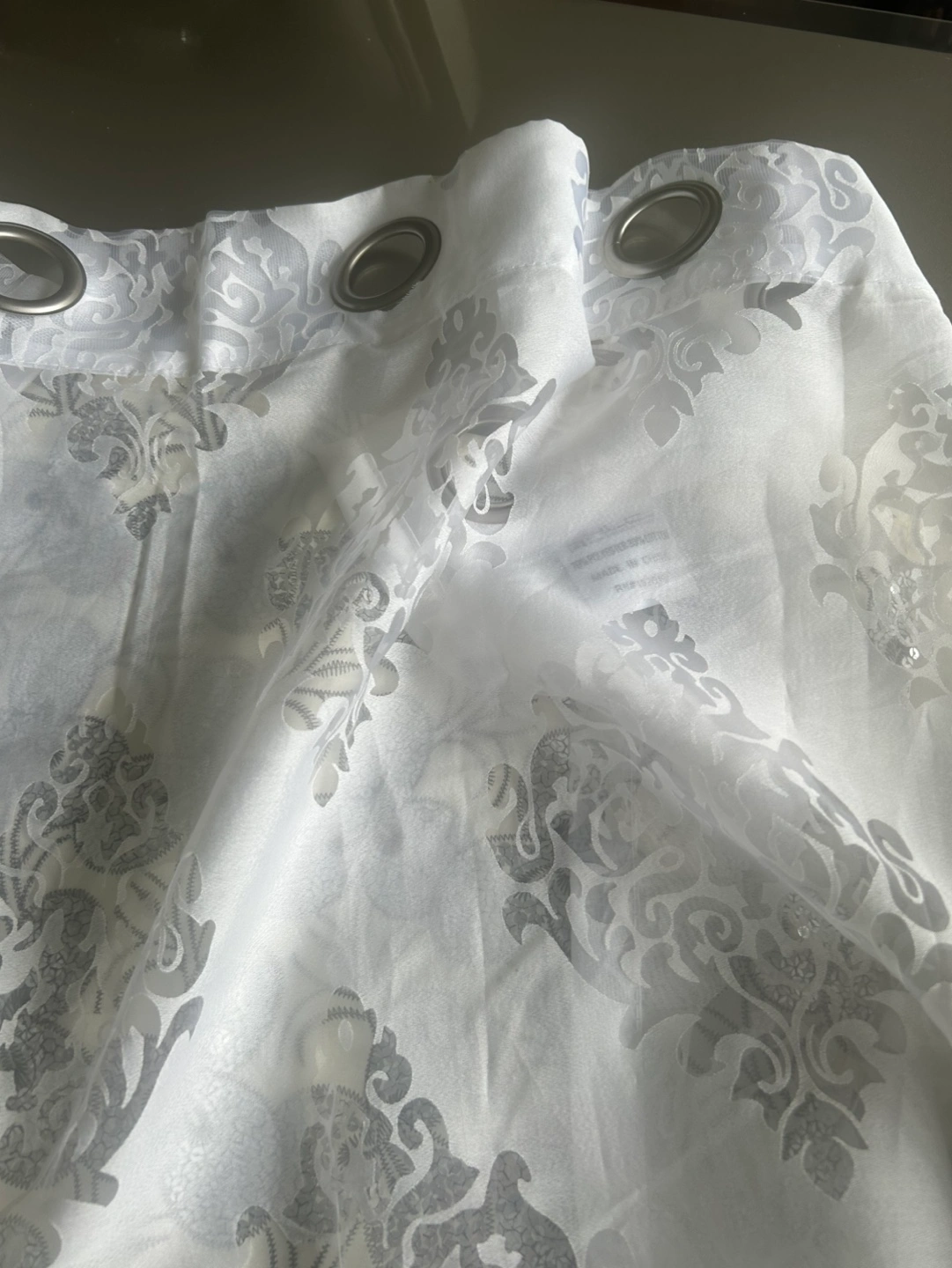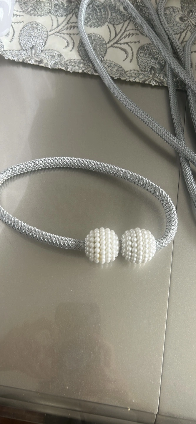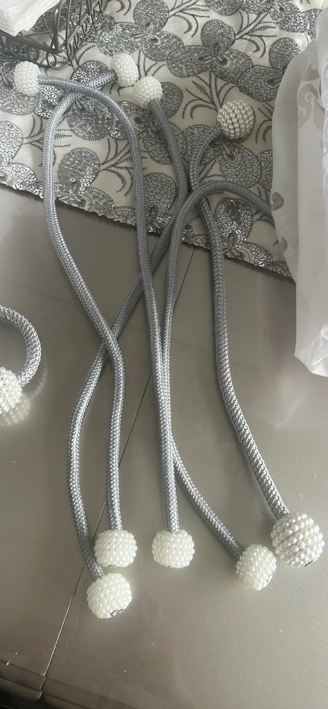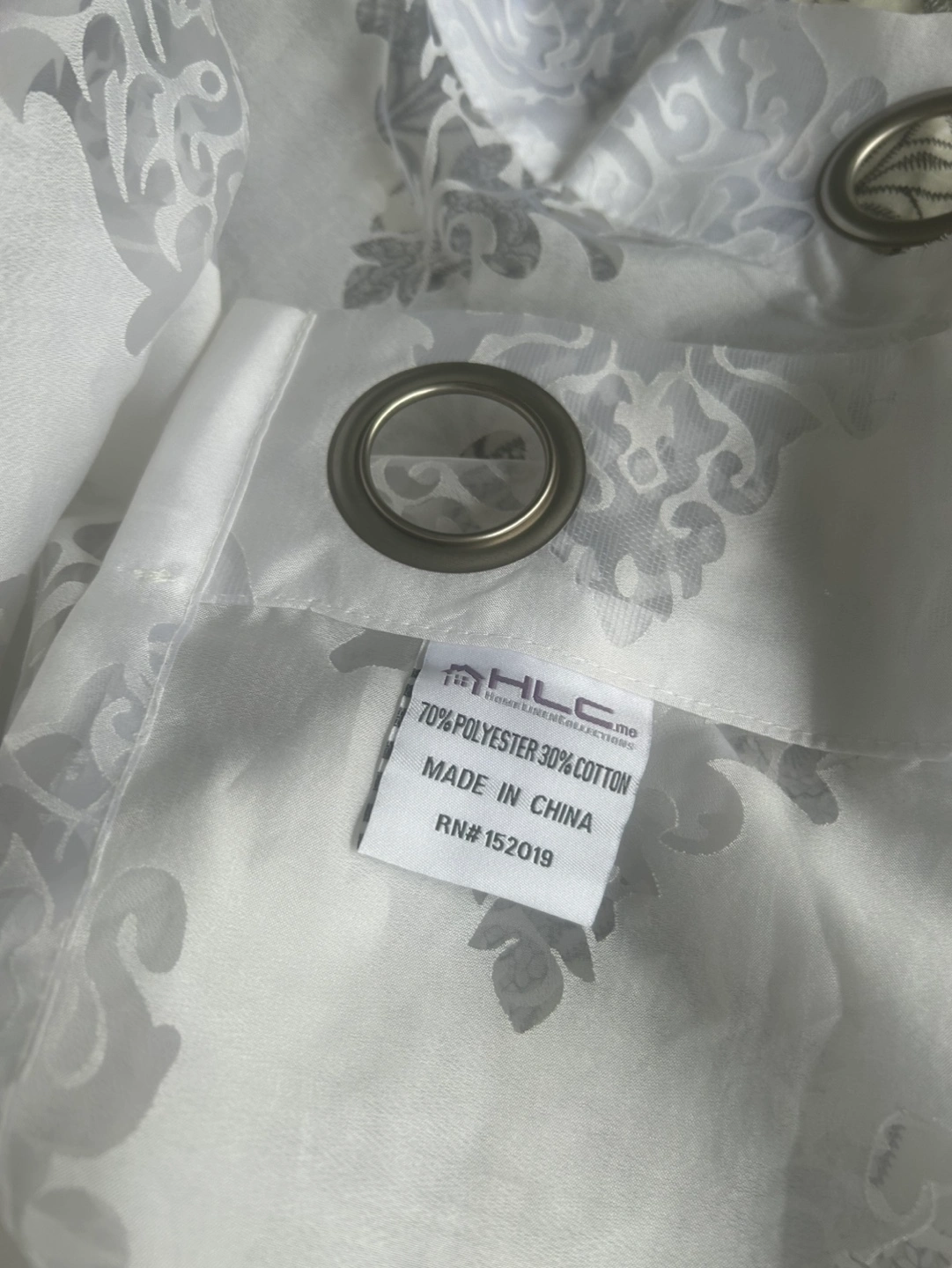 Set of sheer curtains. Features grommets and a delicate grey damask pattern. 70% polyester and 30% cotton. Made in China. 6 panels-$15.00 for all 6 magnetic ropes -$2.00 each