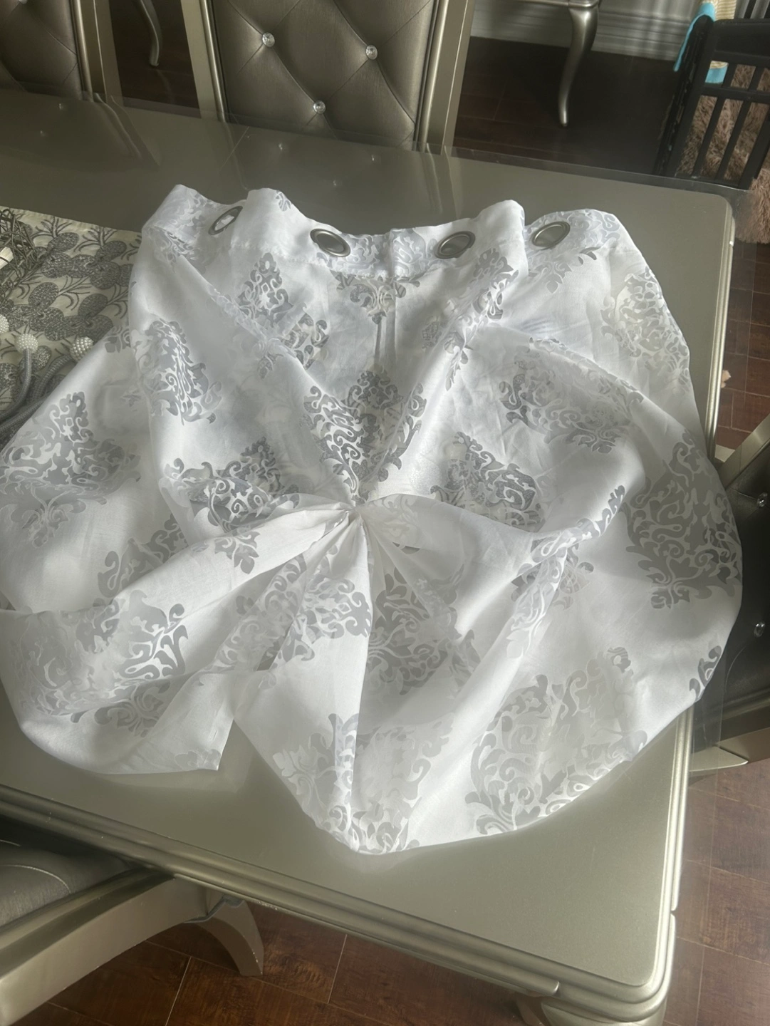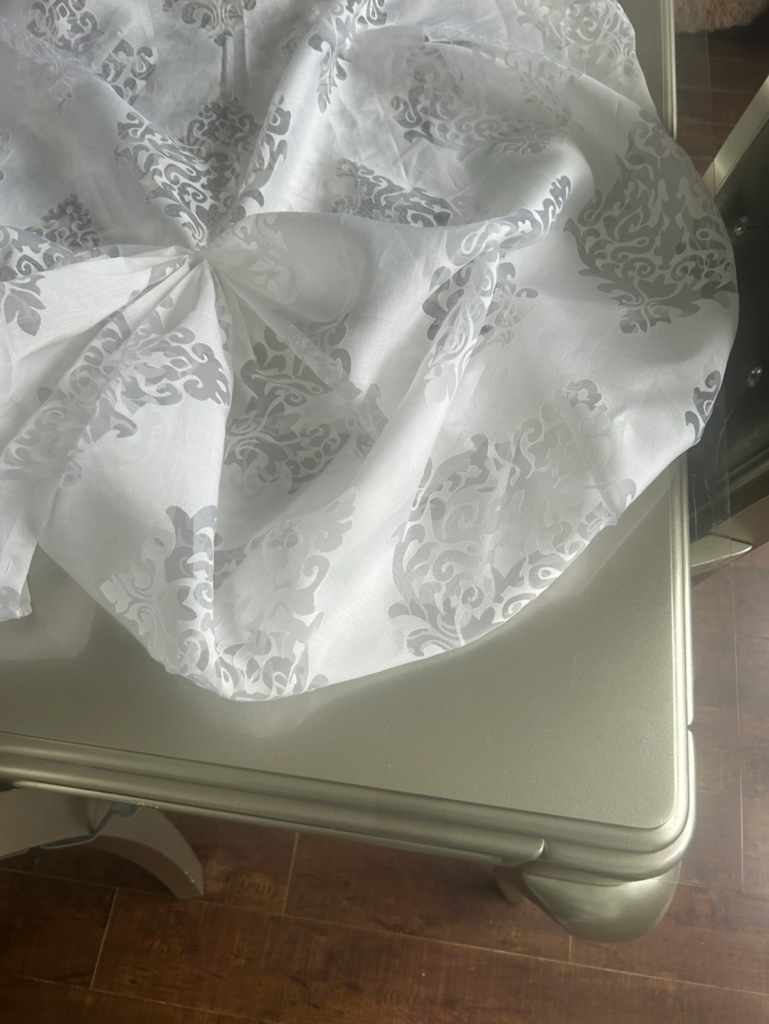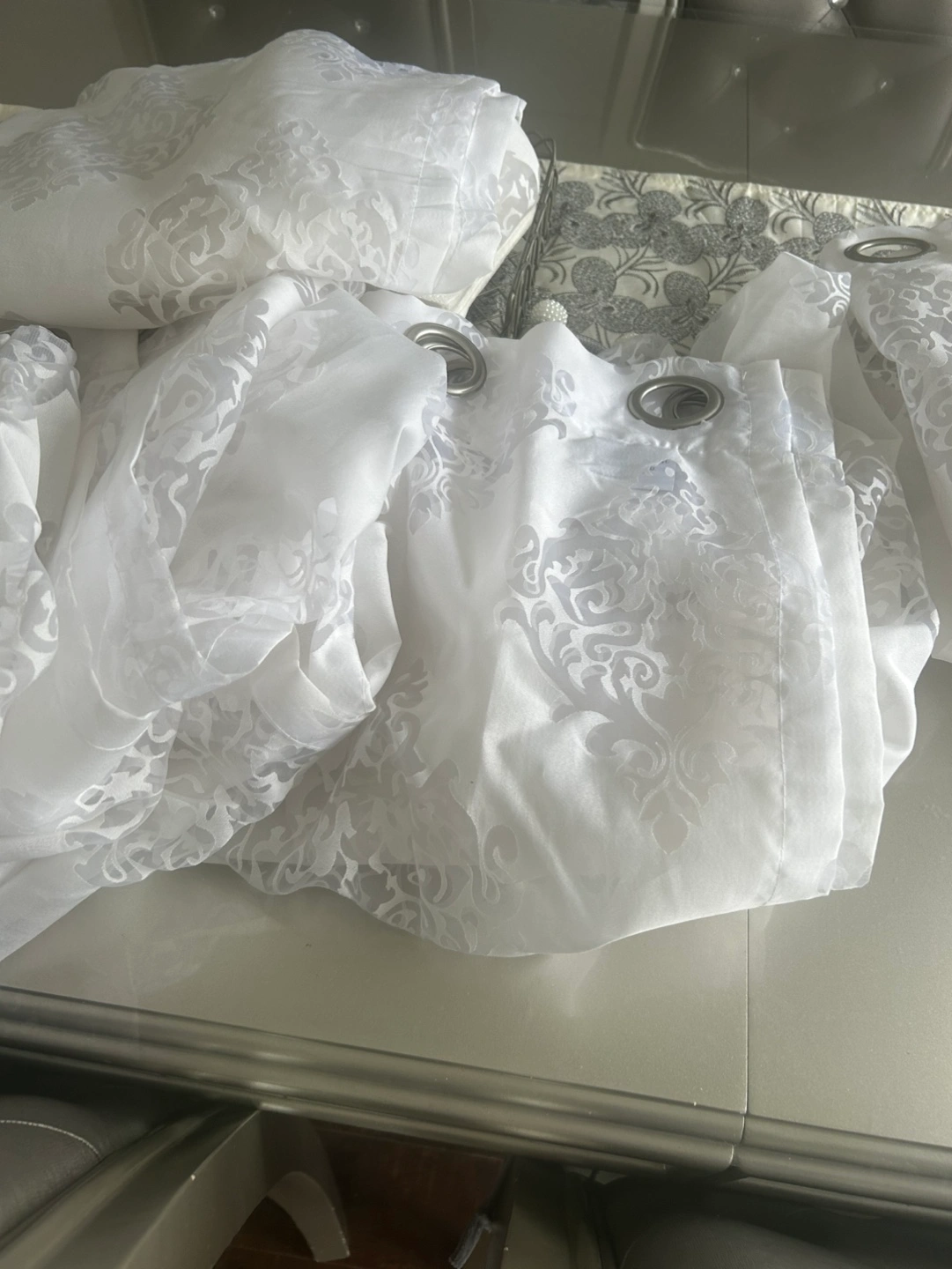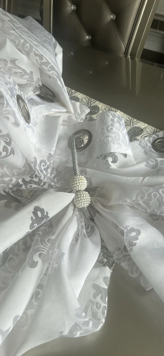 Set of sheer curtains. Features grommets and a delicate grey damask pattern. 70% polyester and 30% cotton. Made in China. 6 panels-$15.00 for all 6 magnetic ropes -$2.00 each