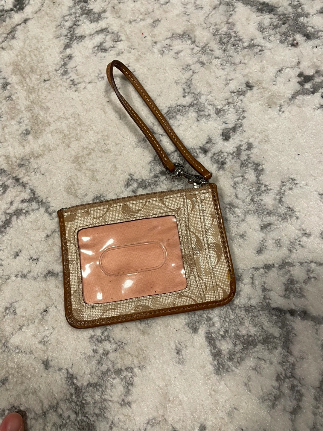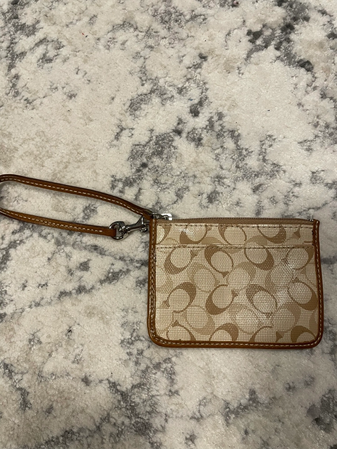 Beige and brown Coach wristlet wallet. Features a zipper closure and an ID window. Small and compact, perfect for everyday use.