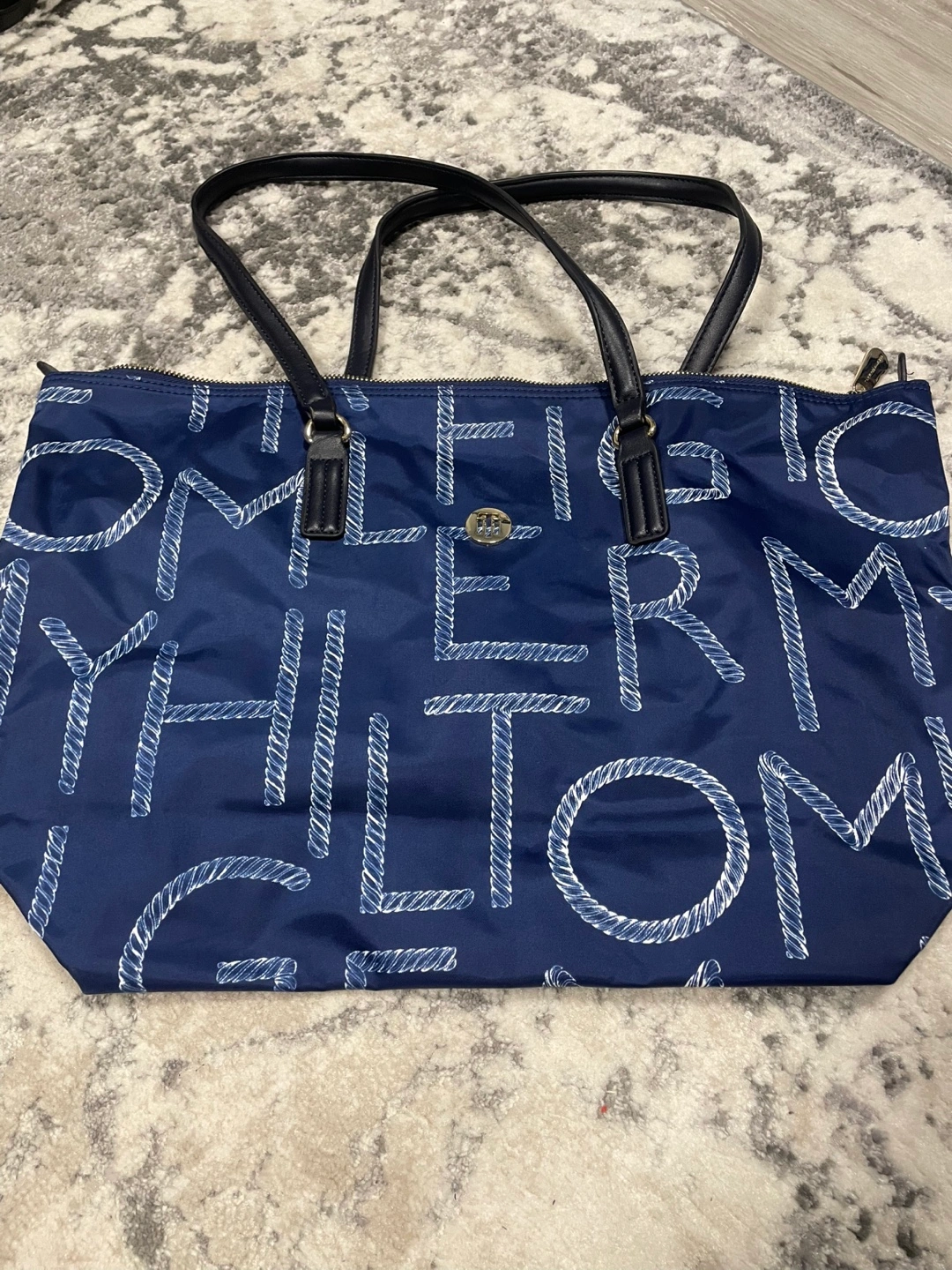 Large navy blue tote bag. Features a rope-patterned Tommy Hilfiger logo. Black leatherette handles. Zip closure.