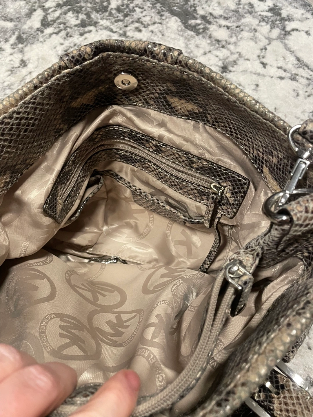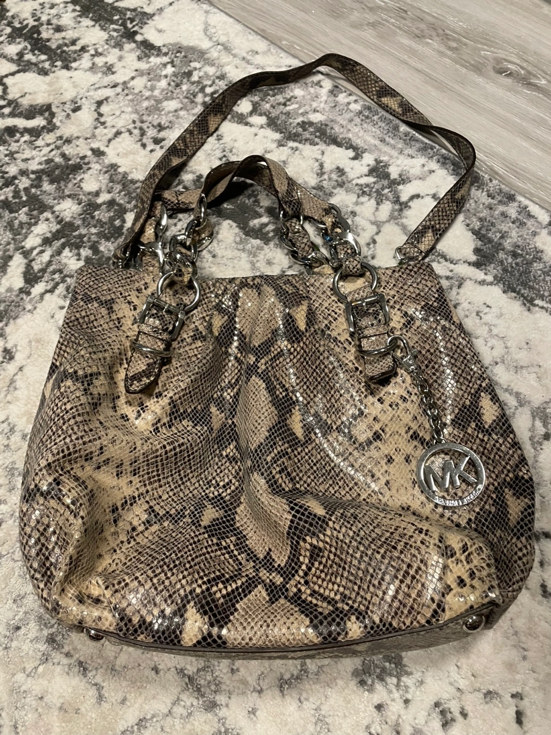 Gorgeous snakeskin print handbag. Features a chain and leather strap, multiple pockets inside. Great for everyday use.