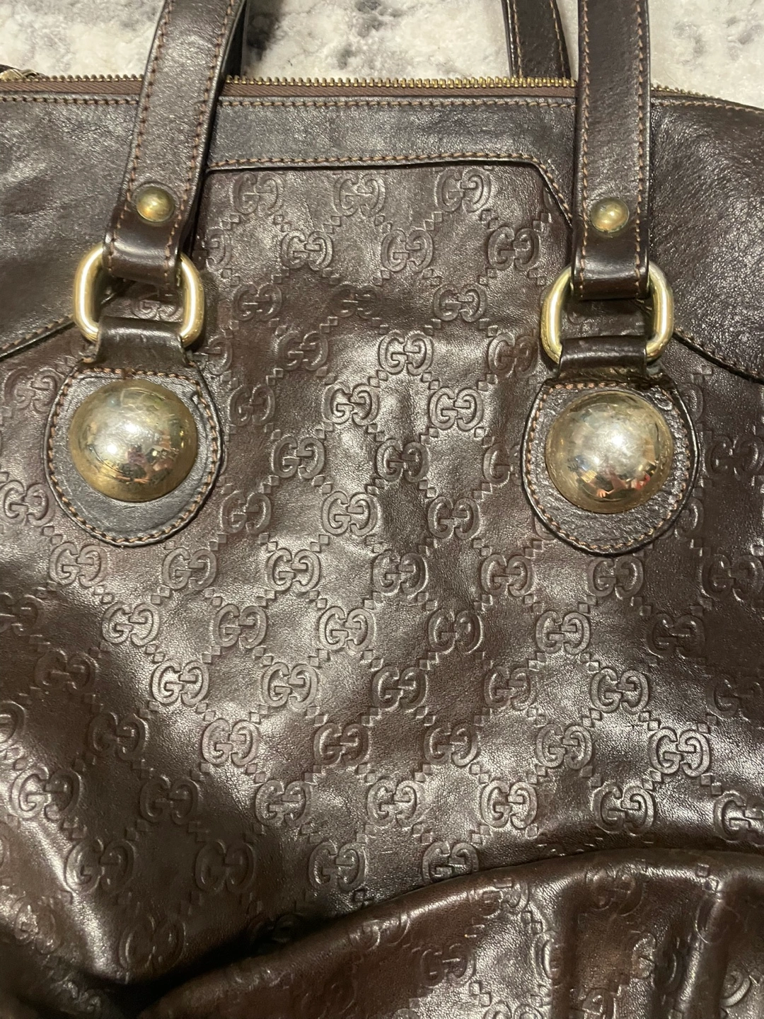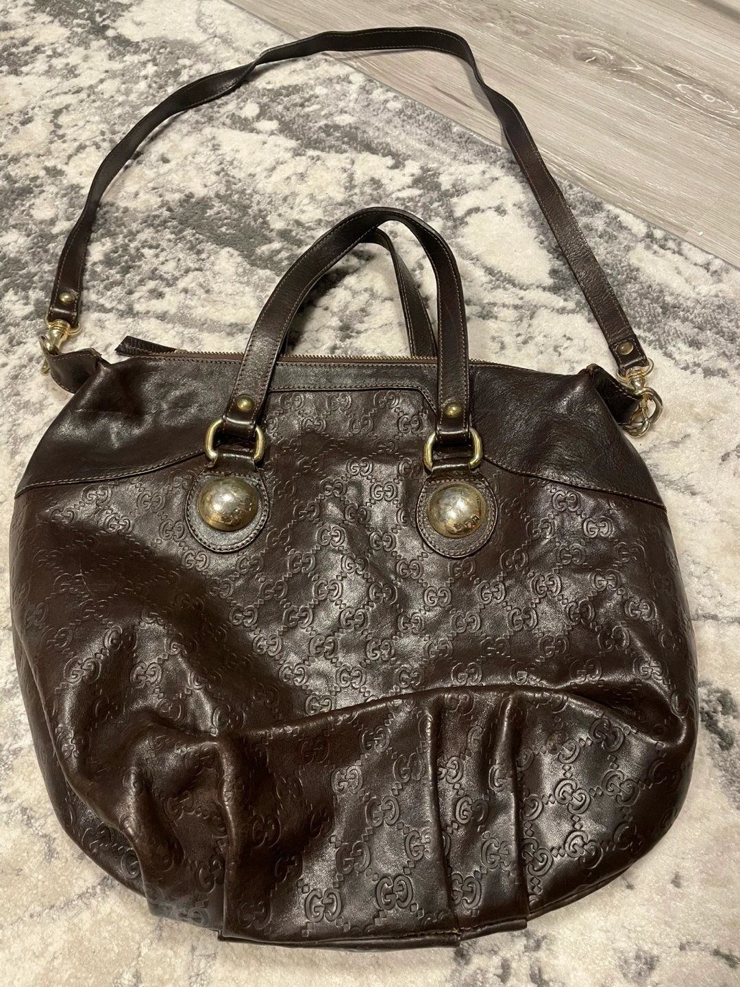 Gorgeous dark brown leather Gucci handbag. Features a GG pattern, dual top handles, and a shoulder strap. Zipper closure. Pre-owned. Zipper broken. Easy fix $20-30 to repair the zipper