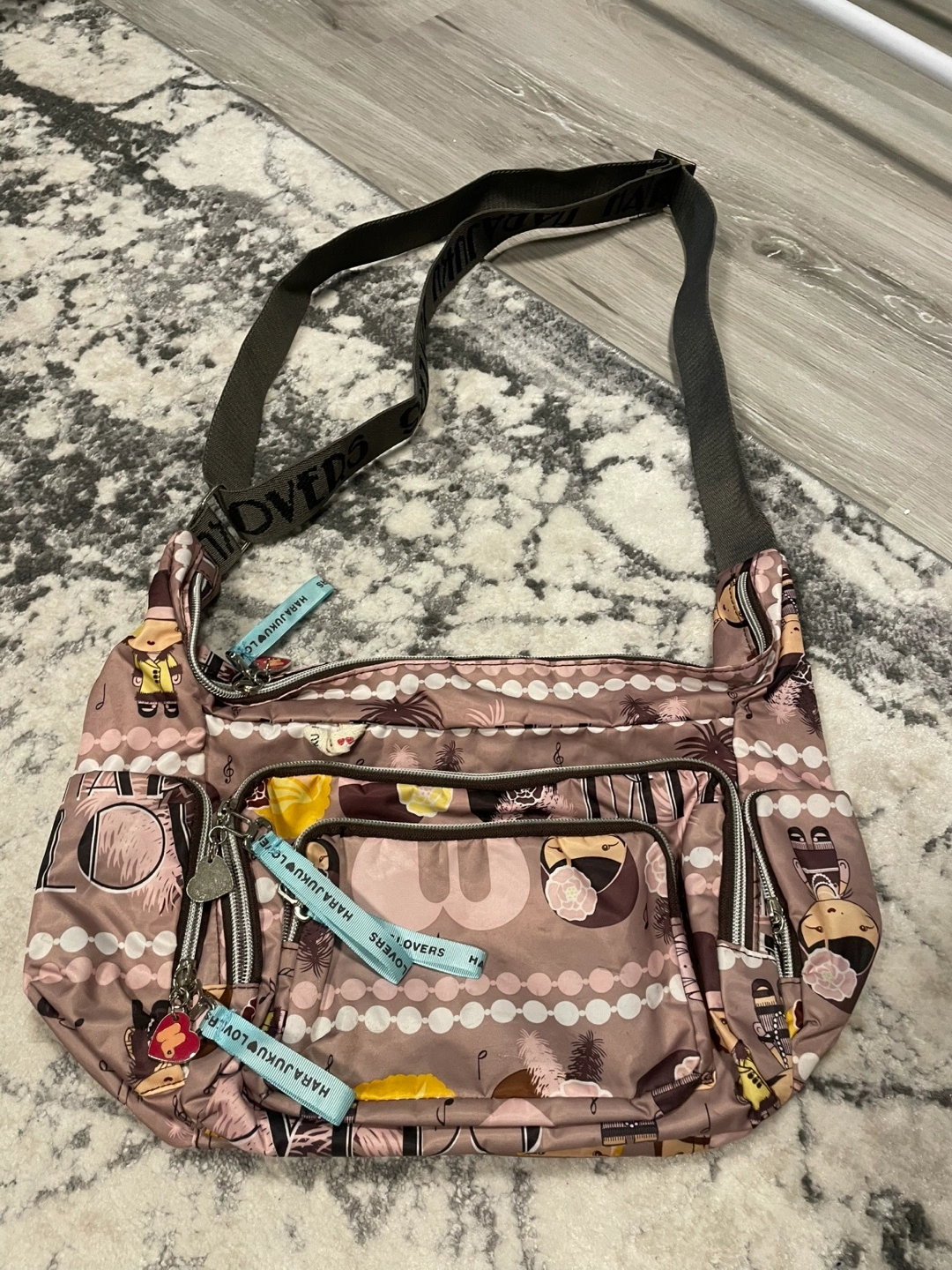 Cute Harajuku Lovers crossbody bag. Features multiple pockets and adjustable strap. Great for everyday use.