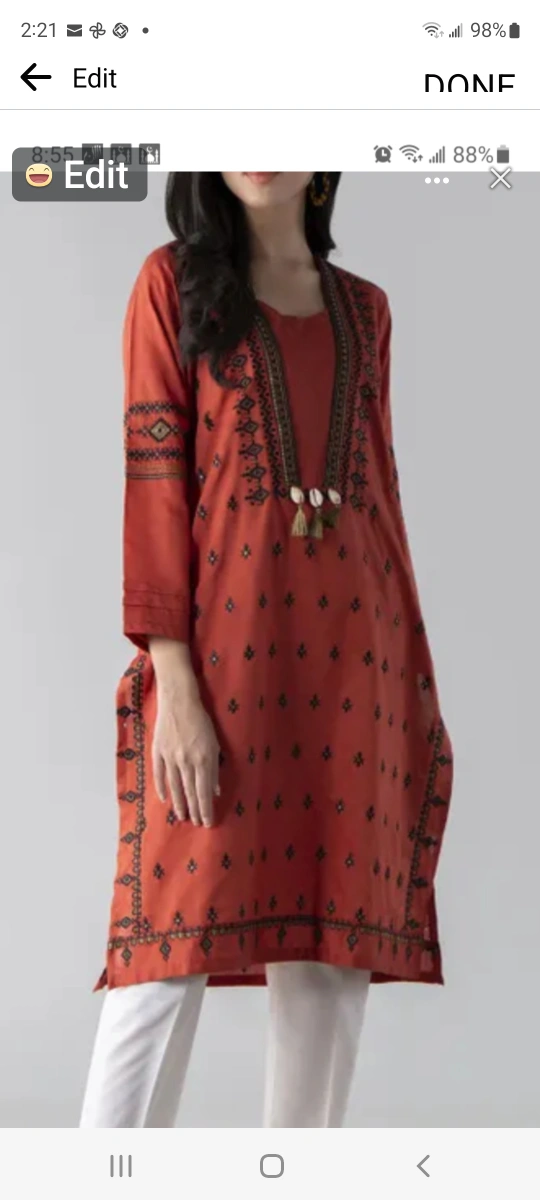 Beautiful terracotta coloured embroidered kurta with matching pants. Intricate detailing. . Side slits. Includes matching dupatta. Perfect for special occasions.
