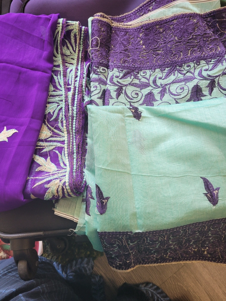 Mint green and purple embroidered three-piece suit. Intricate detailing. Gorgeous colours. Perfect for special occasions unstitch