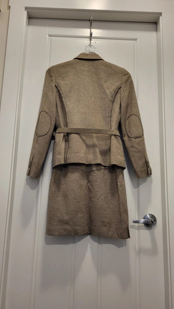 Brown women's suit. Jacket and skirt. Elbow patches. Belted waist. Great for work or special occasions.