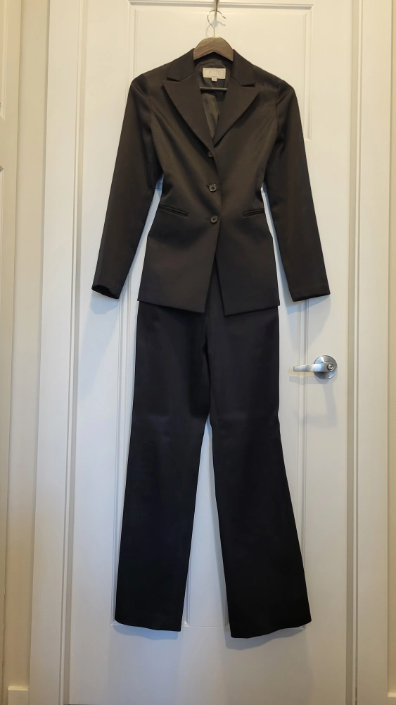 Black women's pant suit. Jacket features long sleeves and a notched collar. Classic professional style.