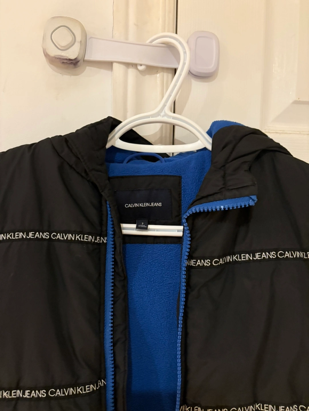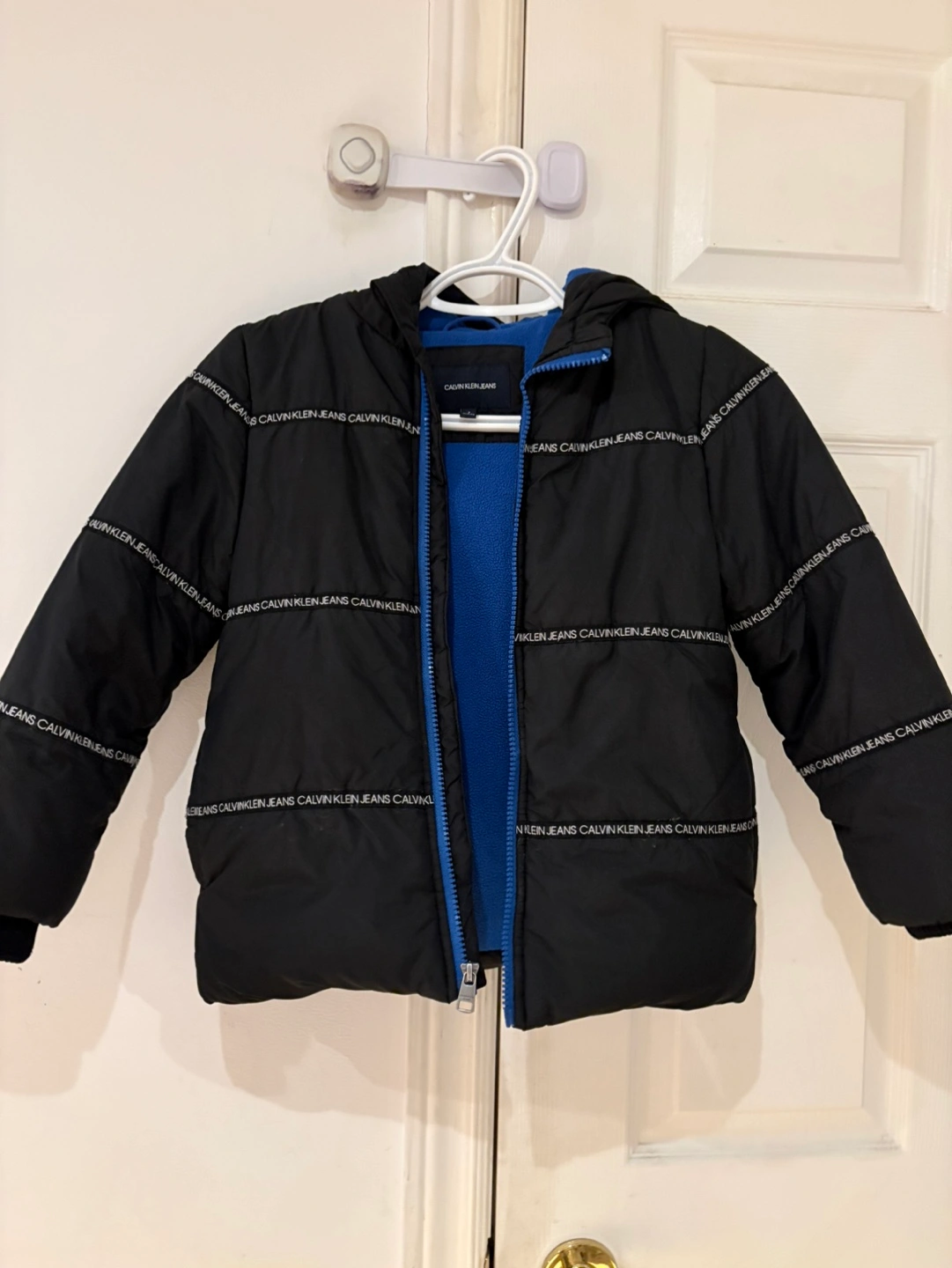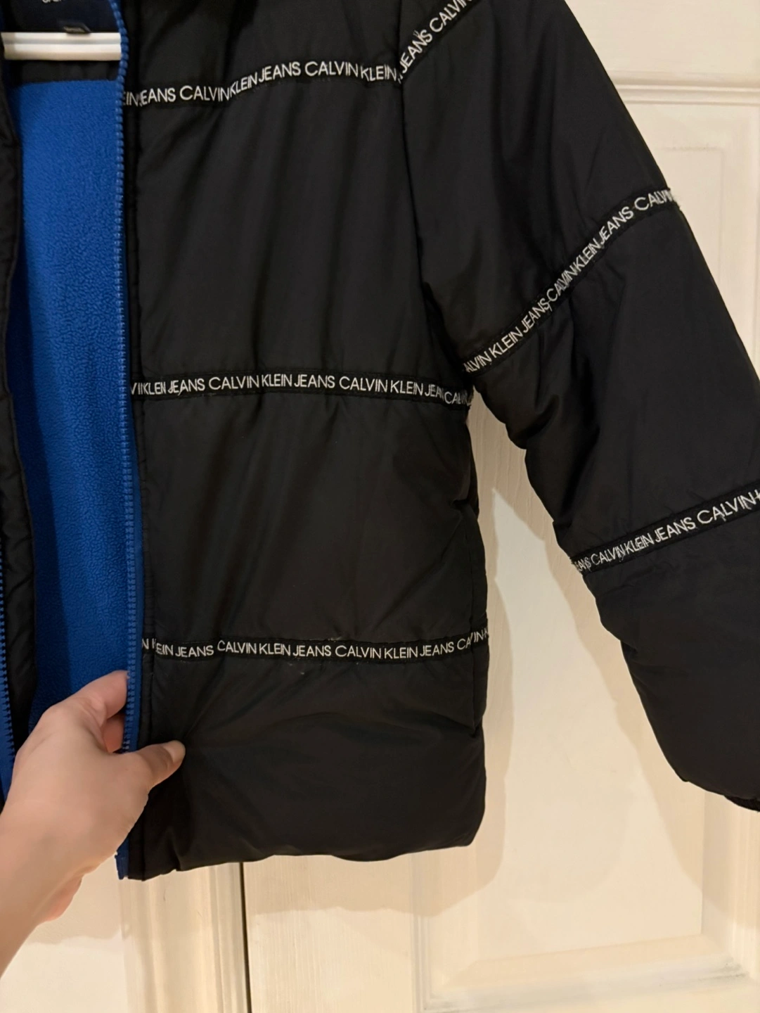 Boys' black puffer jacket. Size 7. Features a blue fleece interior and Calvin Klein Jeans branding throughout. Zipper closure. Great condition.