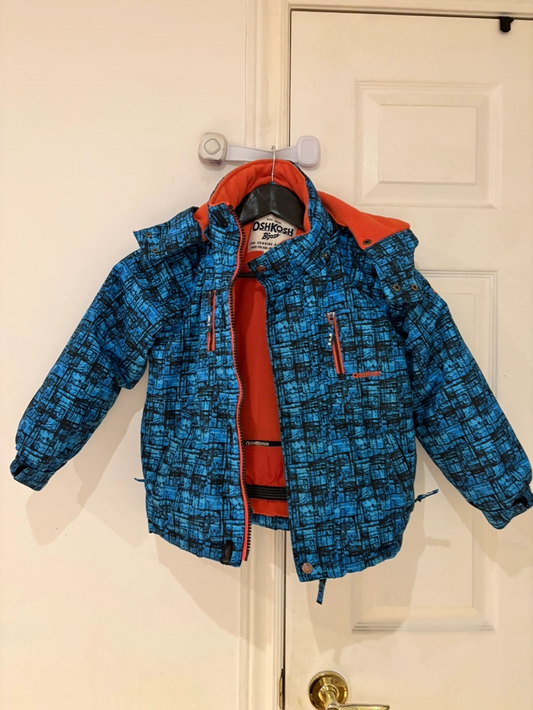 Blue and orange winter jacket. Features a fleece-lined hood. Zipper closure. Great for colder weather. Pre-owned. Size: 4-6years ood