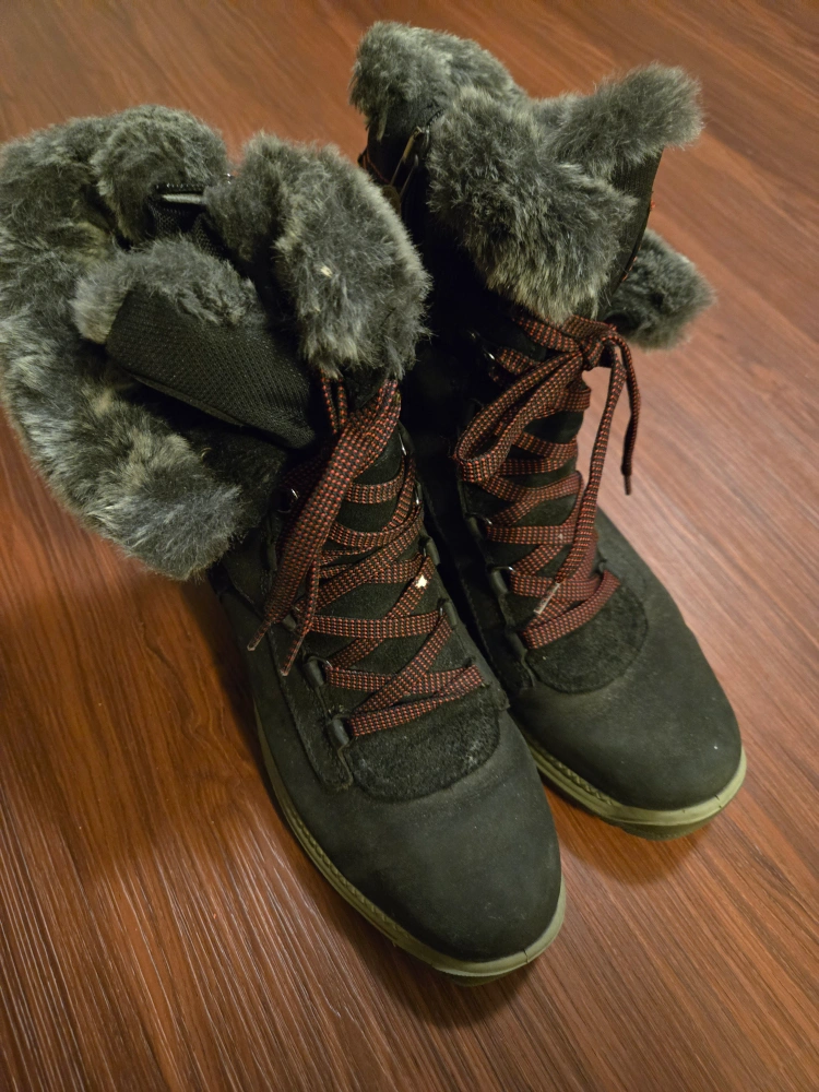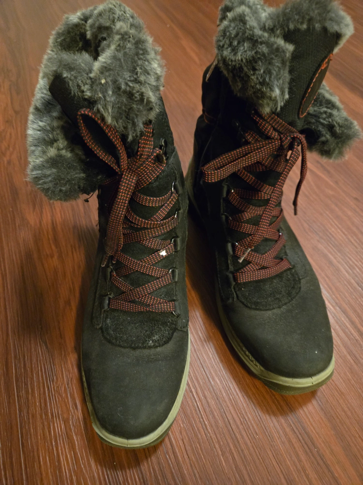 Pair of women's black winter boots. Lace-up style. Faux fur trim around the top. Good tread on the sole.