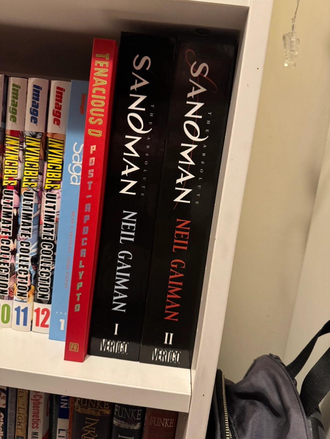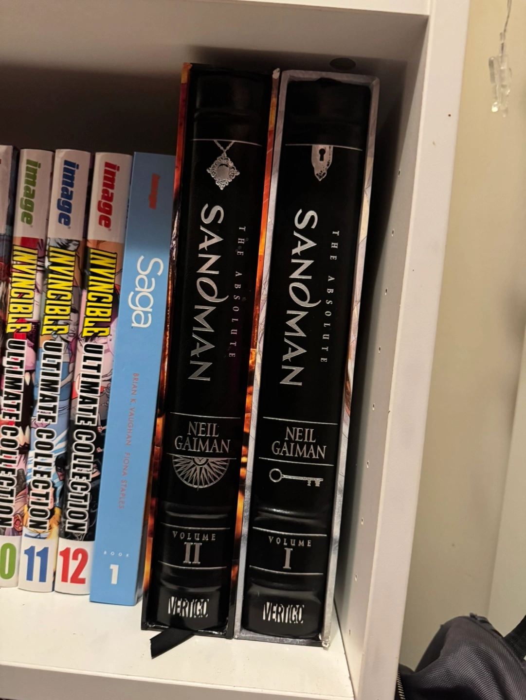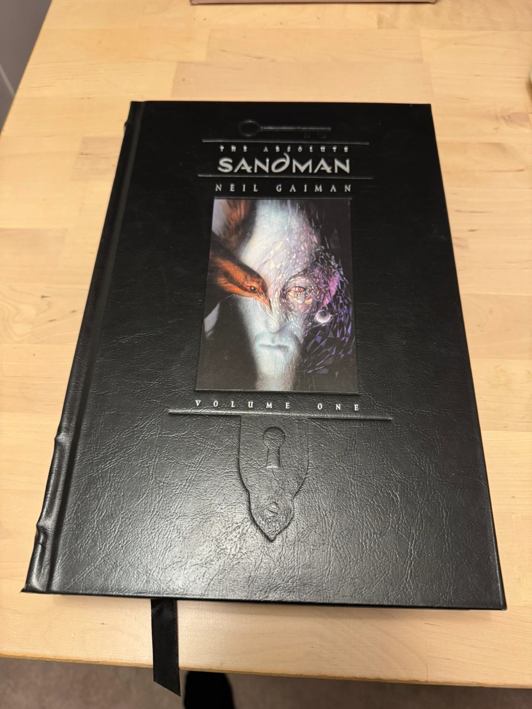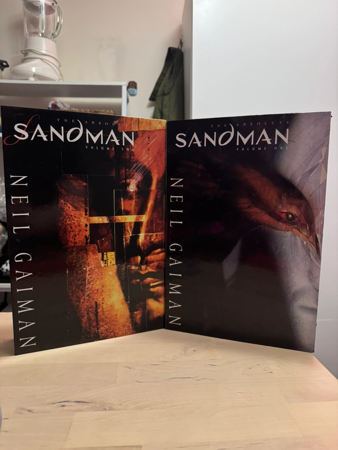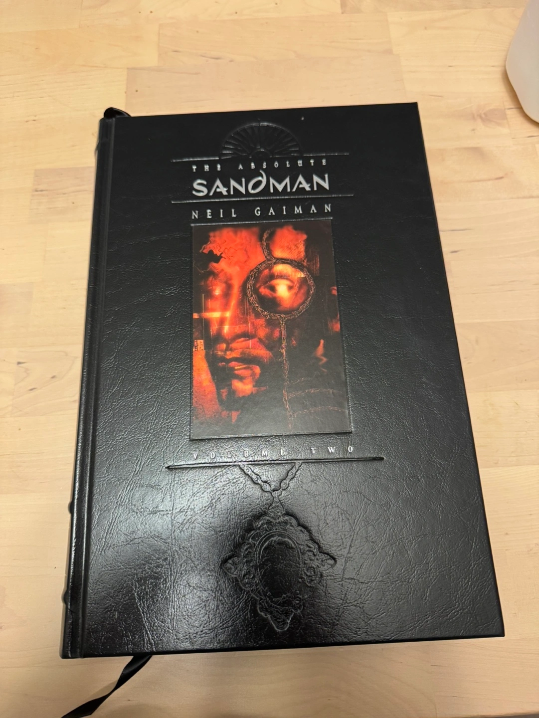 Two hardback books. Neil Gaiman's The Sandman. Volumes one and two. Black leather-like covers. Good condition.