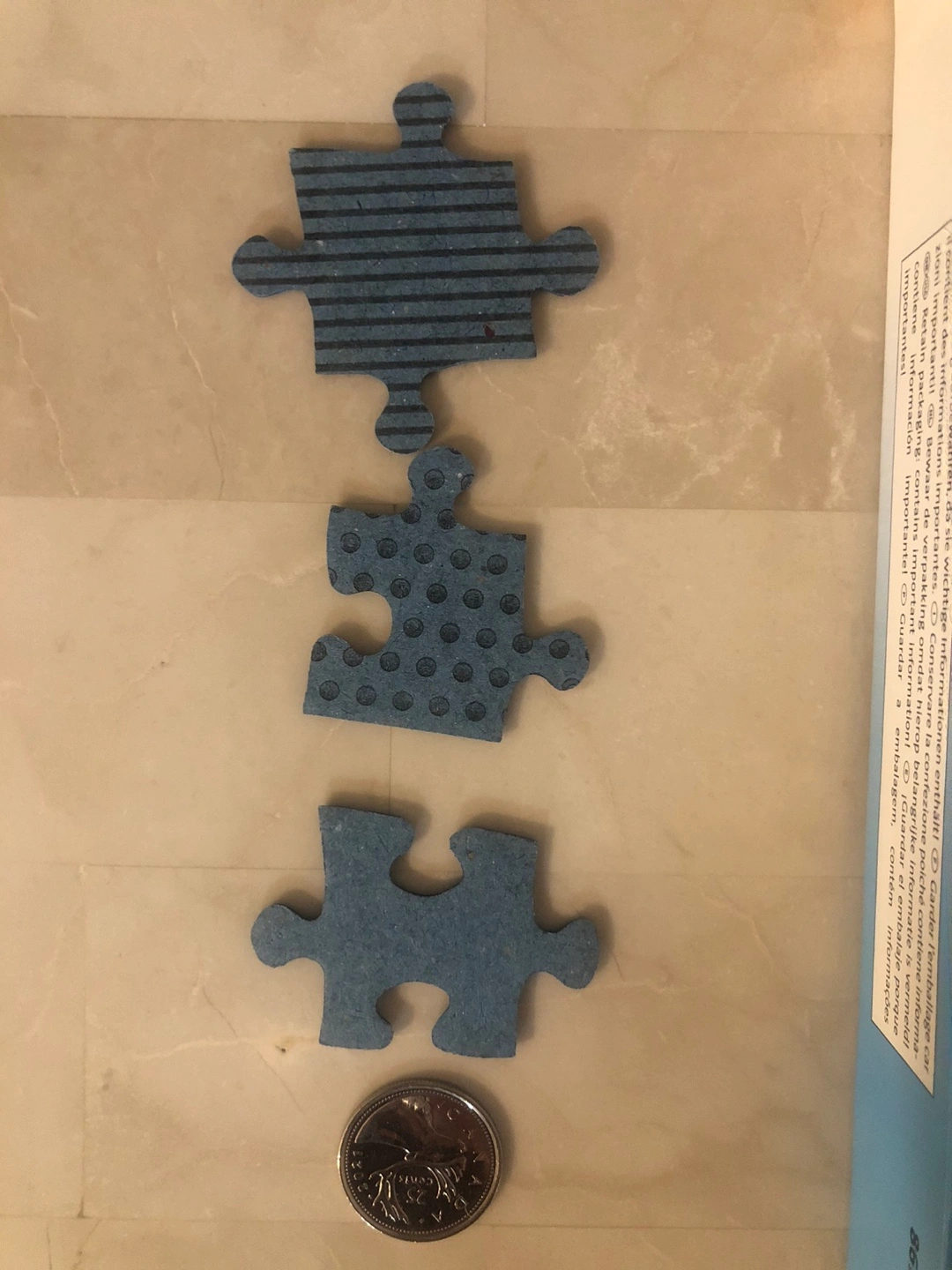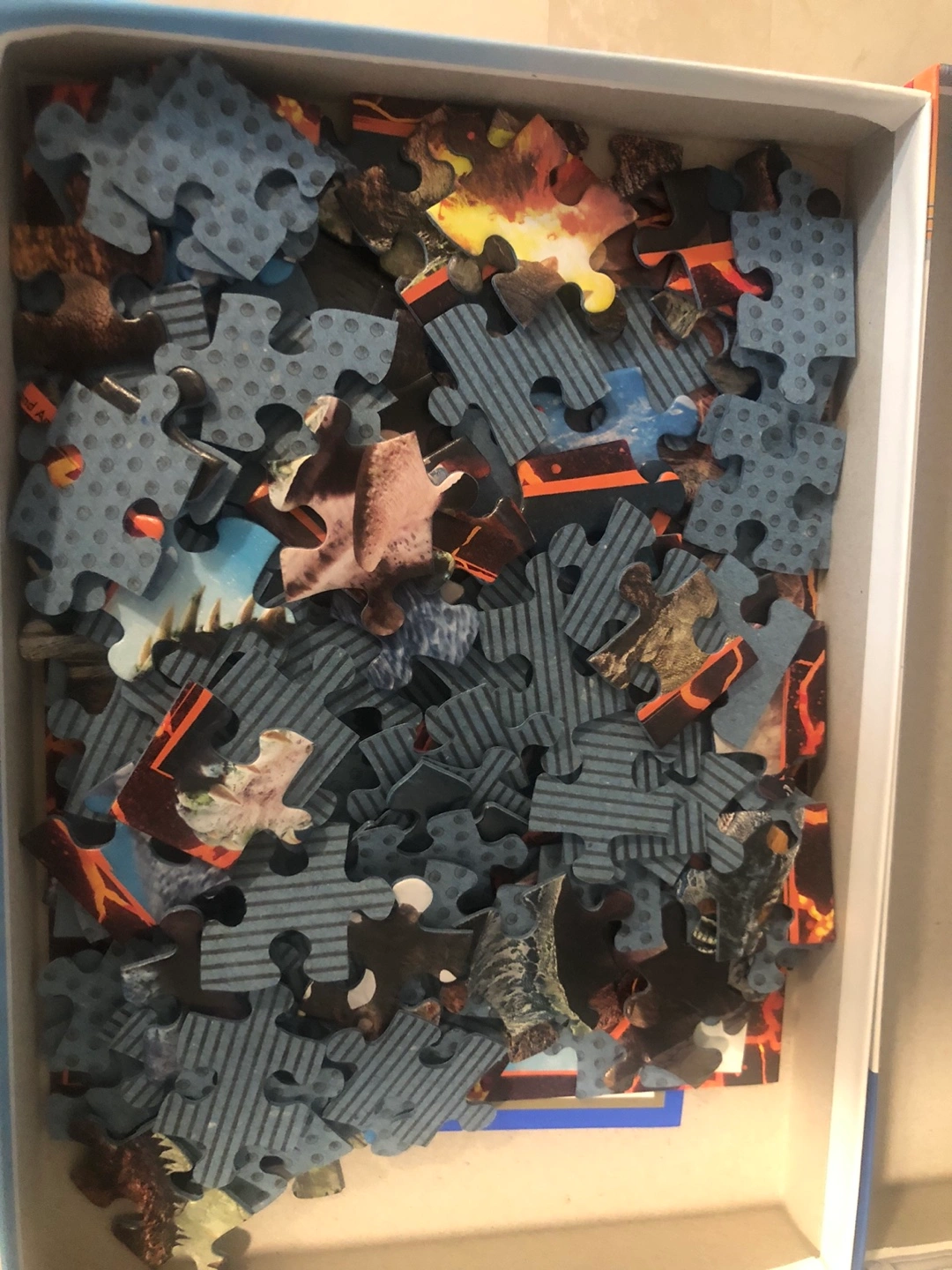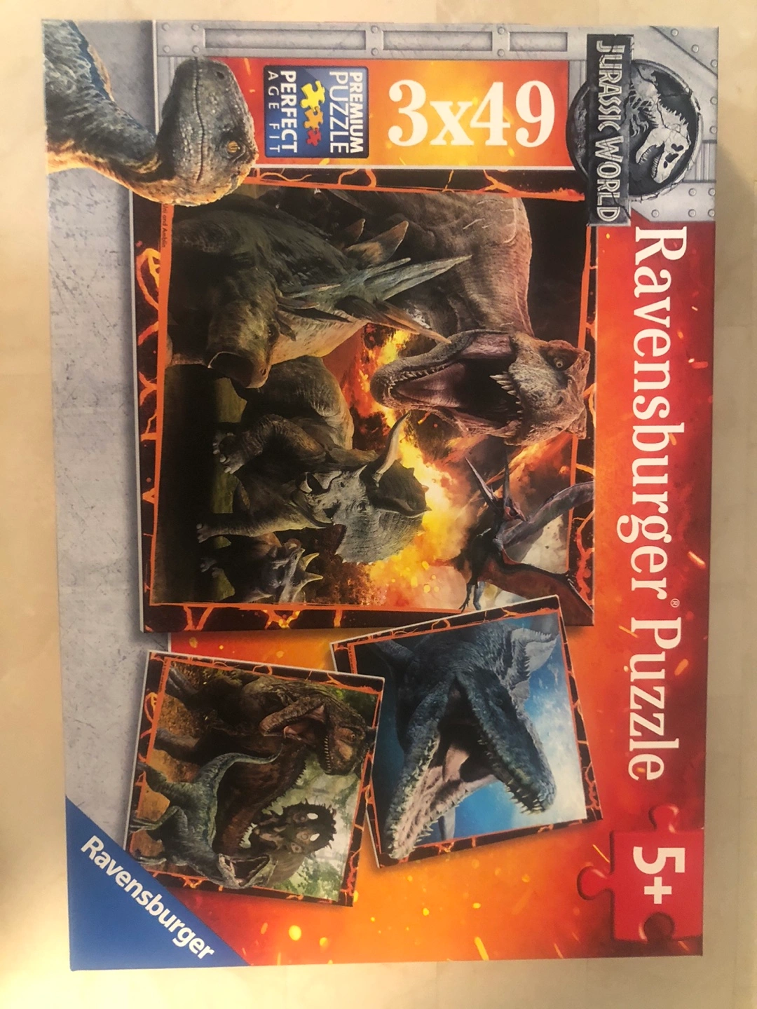 3 x 49-piece jigsaw puzzle. Each puzzle is marked with a different pattern on the back to distinguish them apart. Features dinosaurs and volcanoes. Suitable for ages 5+. Box included.