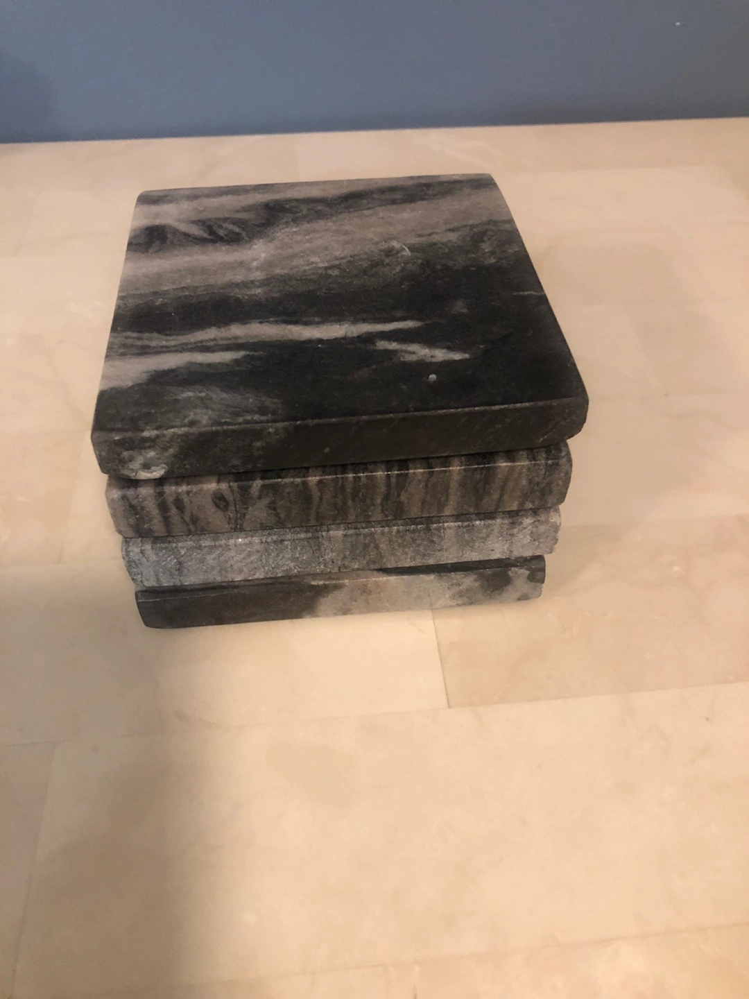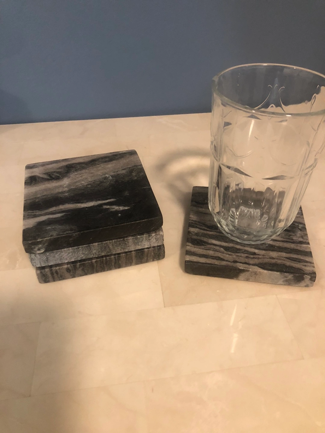 Four square marble coasters. Grey and black marble pattern. Perfect for protecting furniture. Stylish and functional.