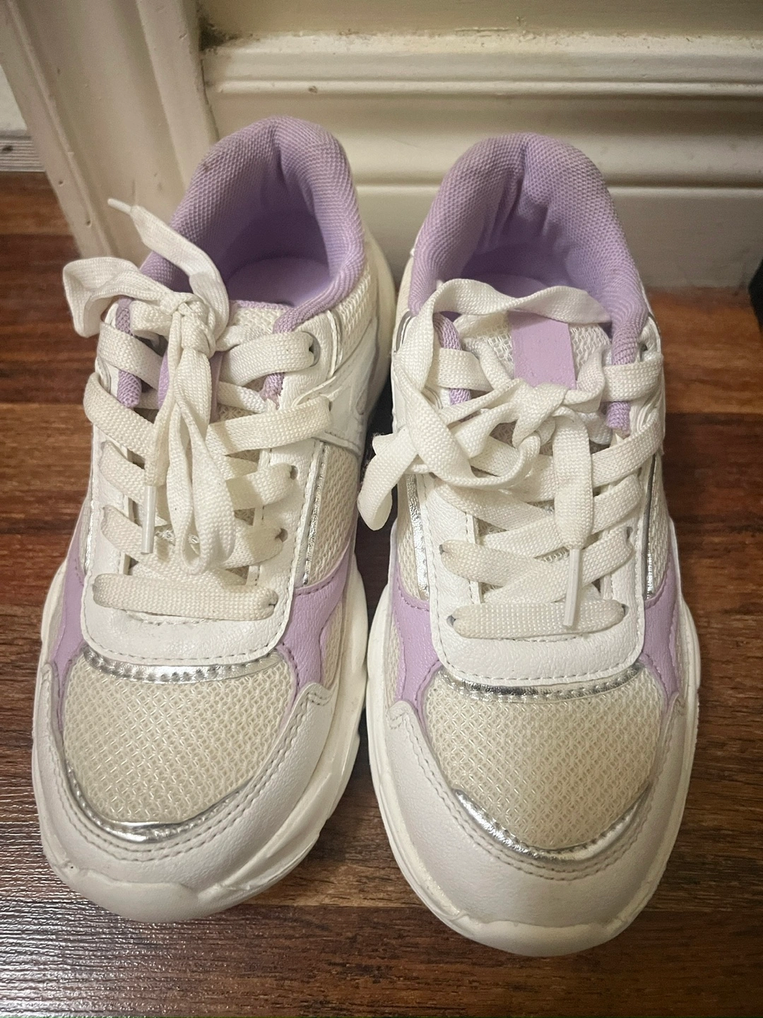 Cute girls' sneakers. White with purple accents. Lace-up closure. Casual style. Good for everyday wear.
