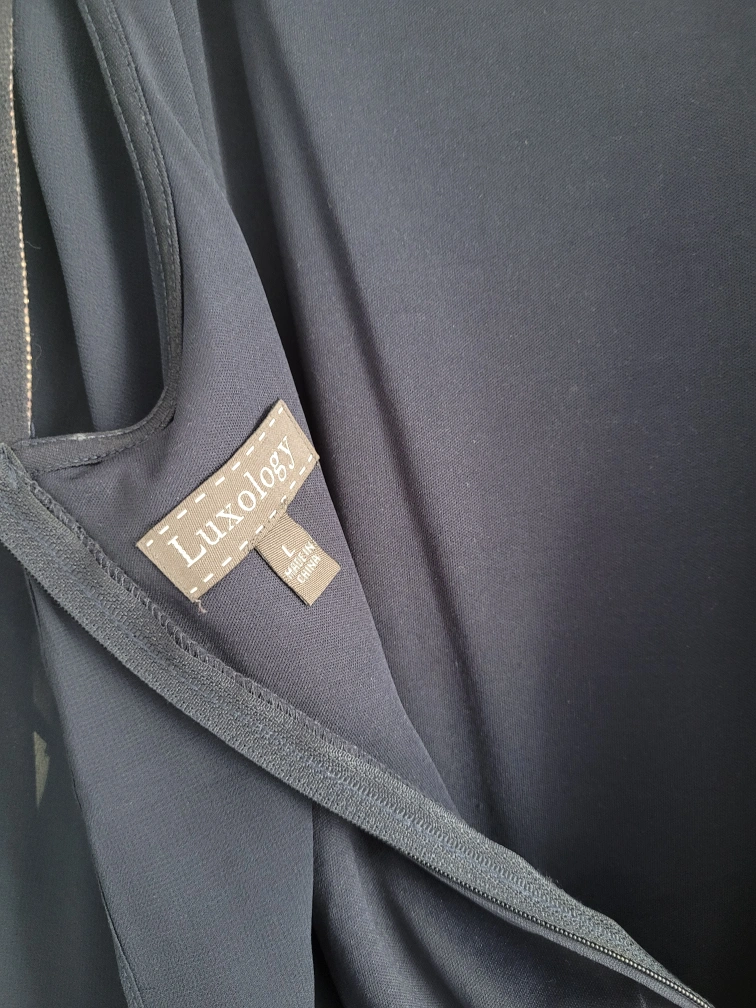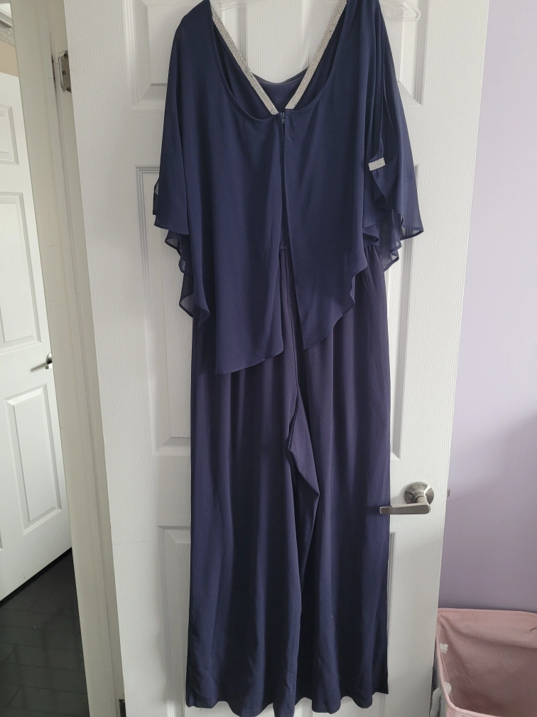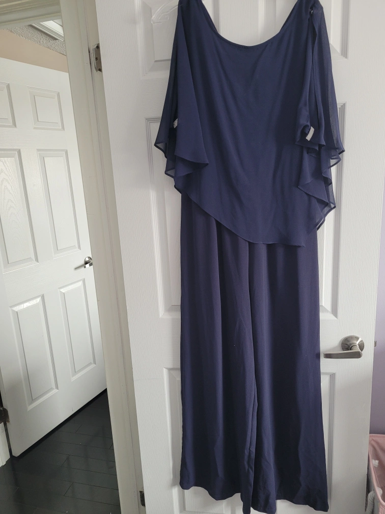Elegant navy blue jumpsuit. Size large. Features a chiffon overlay and wide-leg pants. Back zipper closure. Perfect for a special occasion.