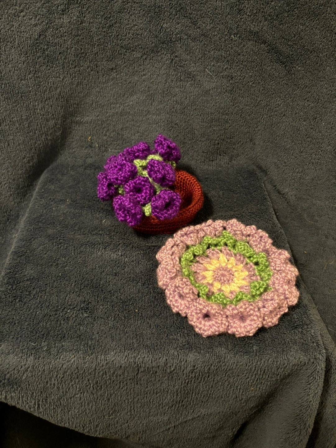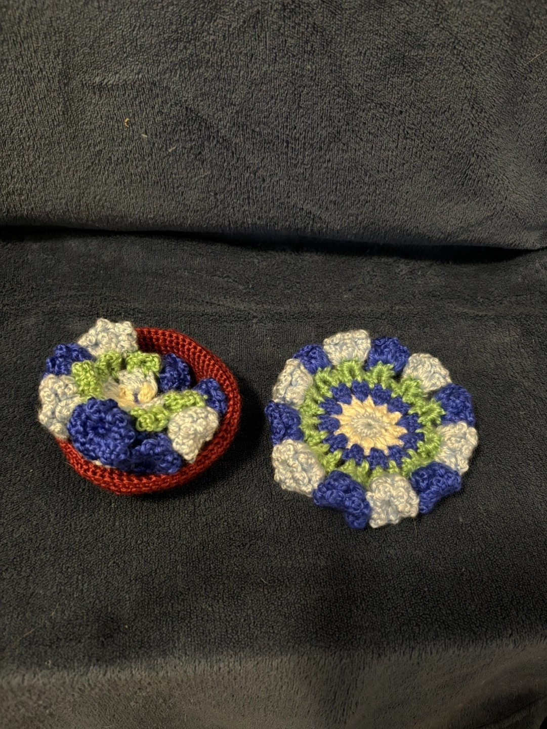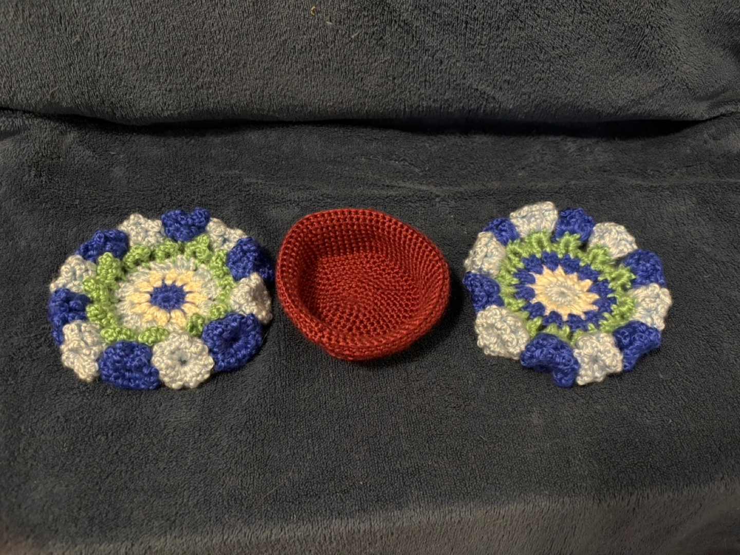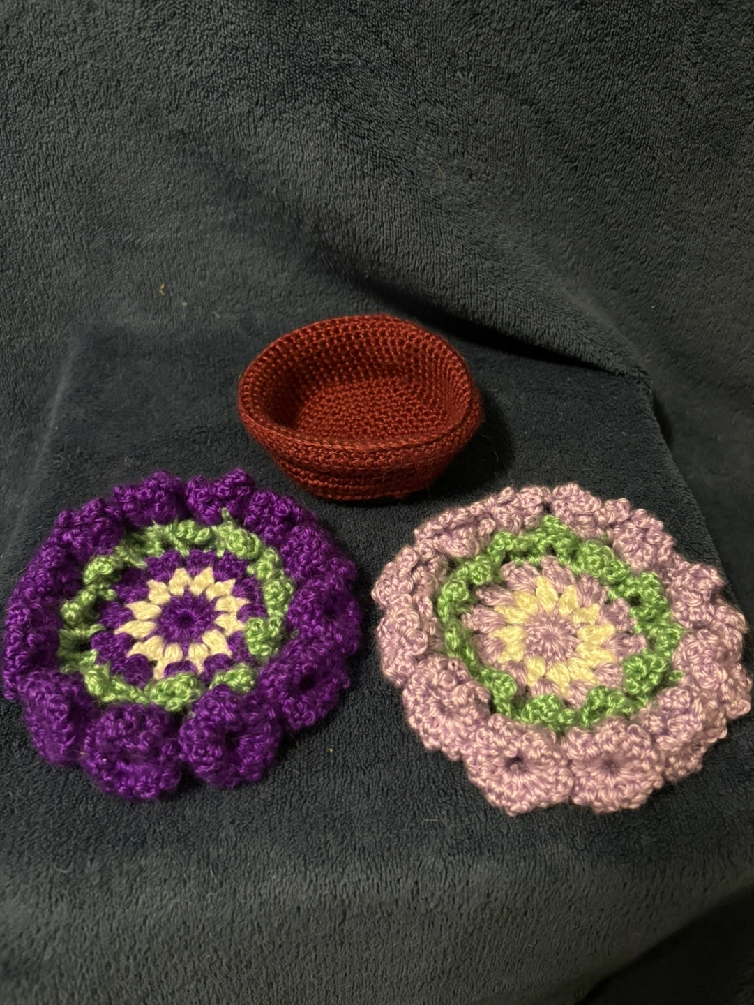 Set of crocheted items. Includes two small coasters with pot holder when not in use. Various colours. Perfect for home decor or gifts.
