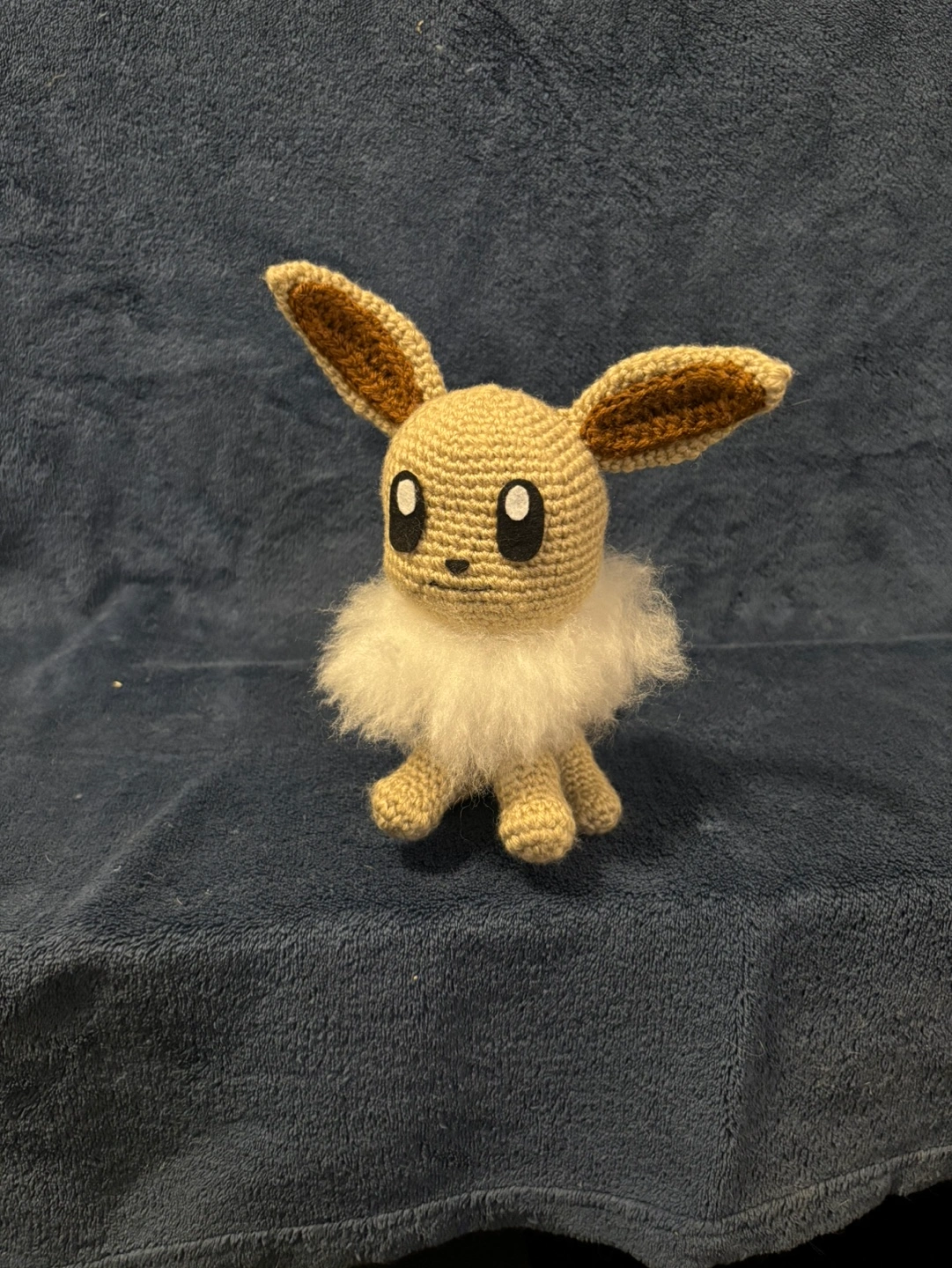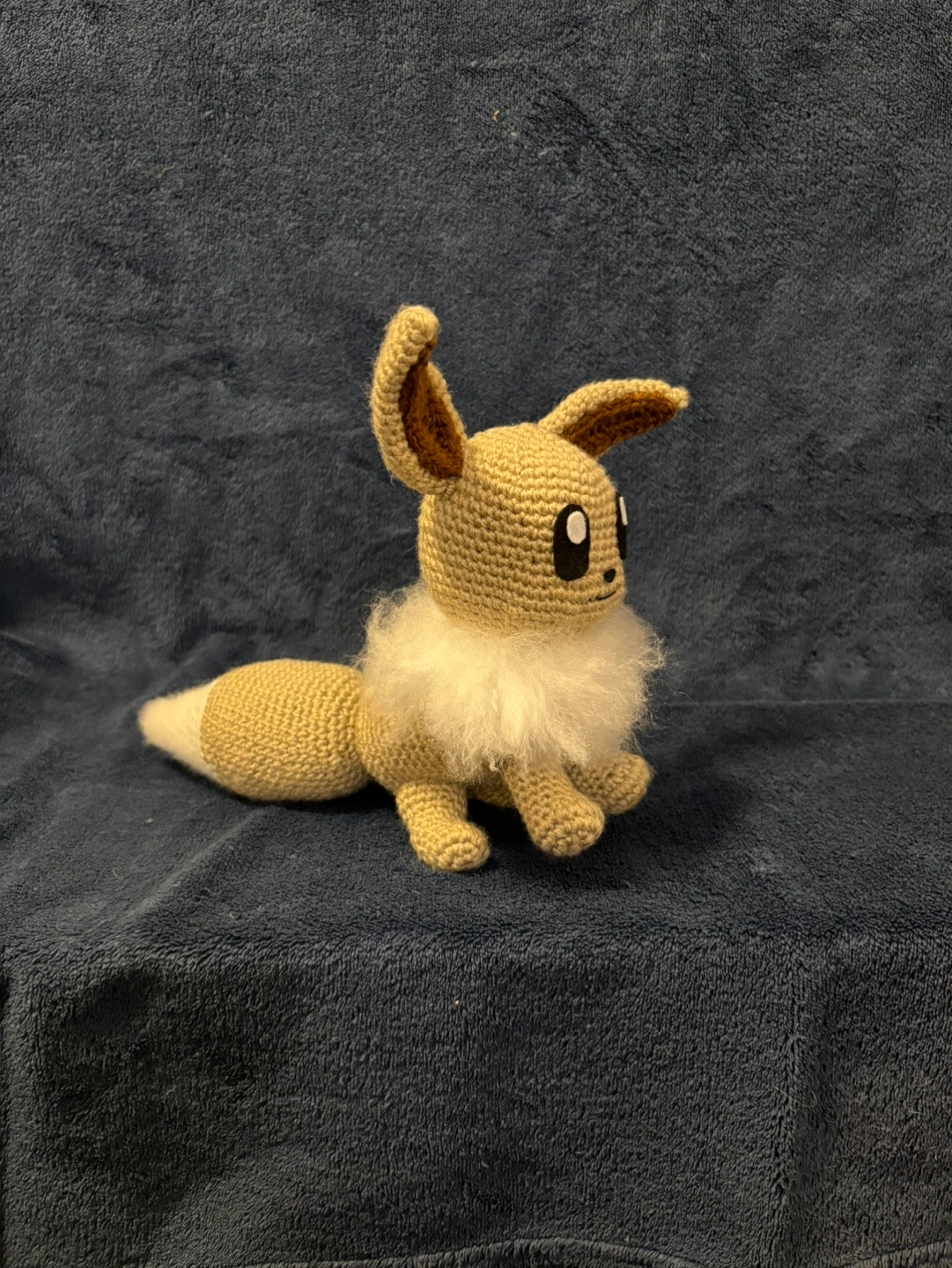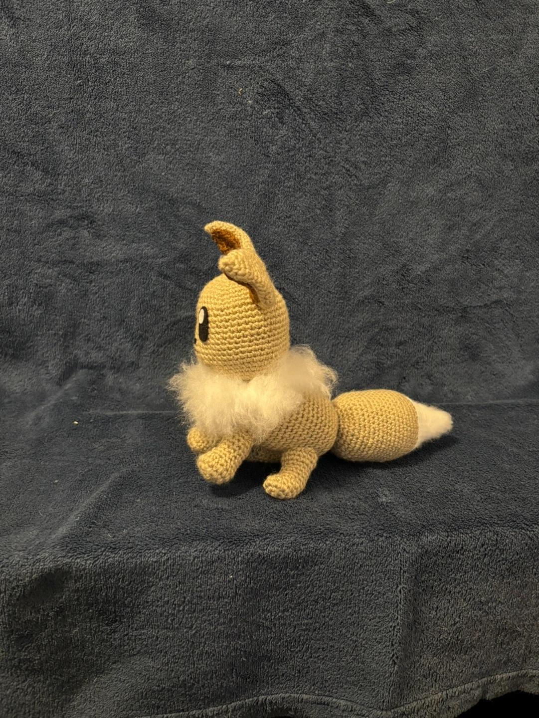 Adorable crocheted Eevee plush. Perfect gift for Pokémon fans. Cream coloured body, brown ears and fluffy white neck fur. Unique handmade item.