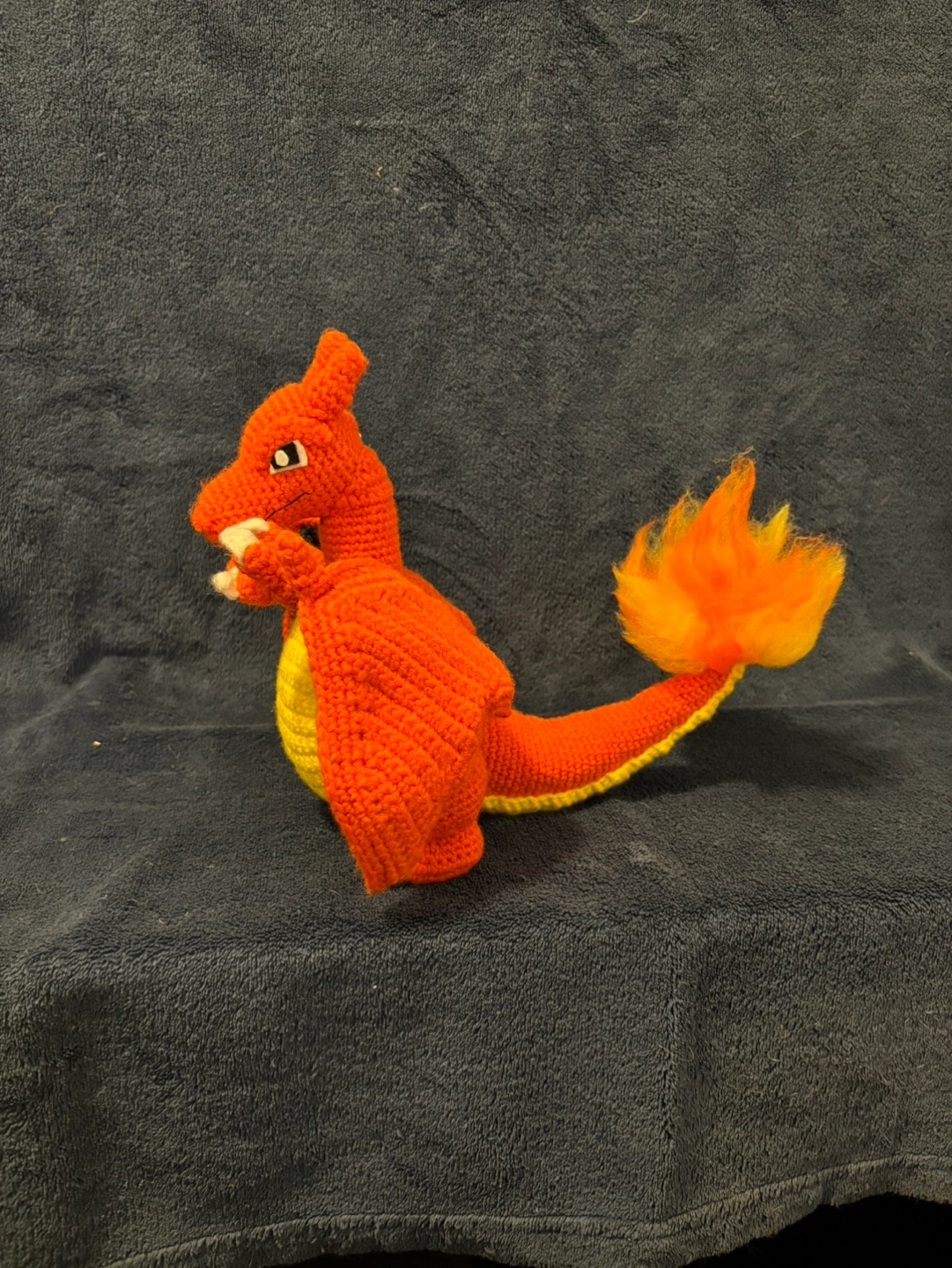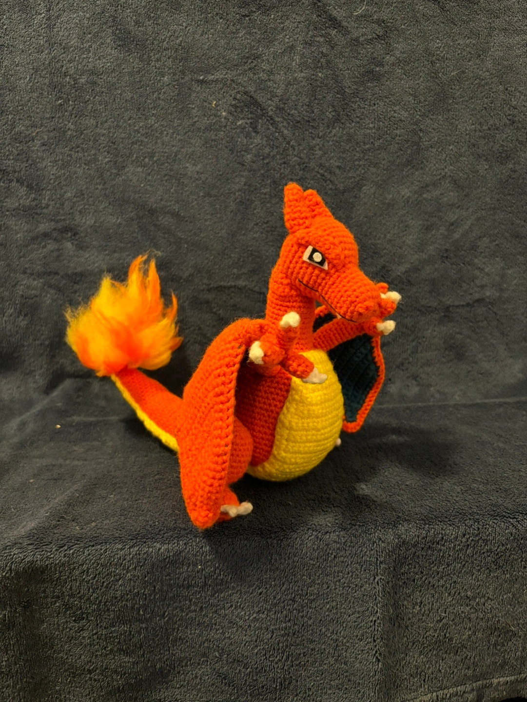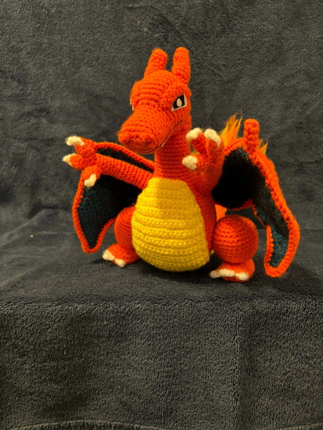 Adorable crocheted Charizard. Orange and yellow yarn. Detailed features. Great gift for Pokémon fans. Unique collectible.