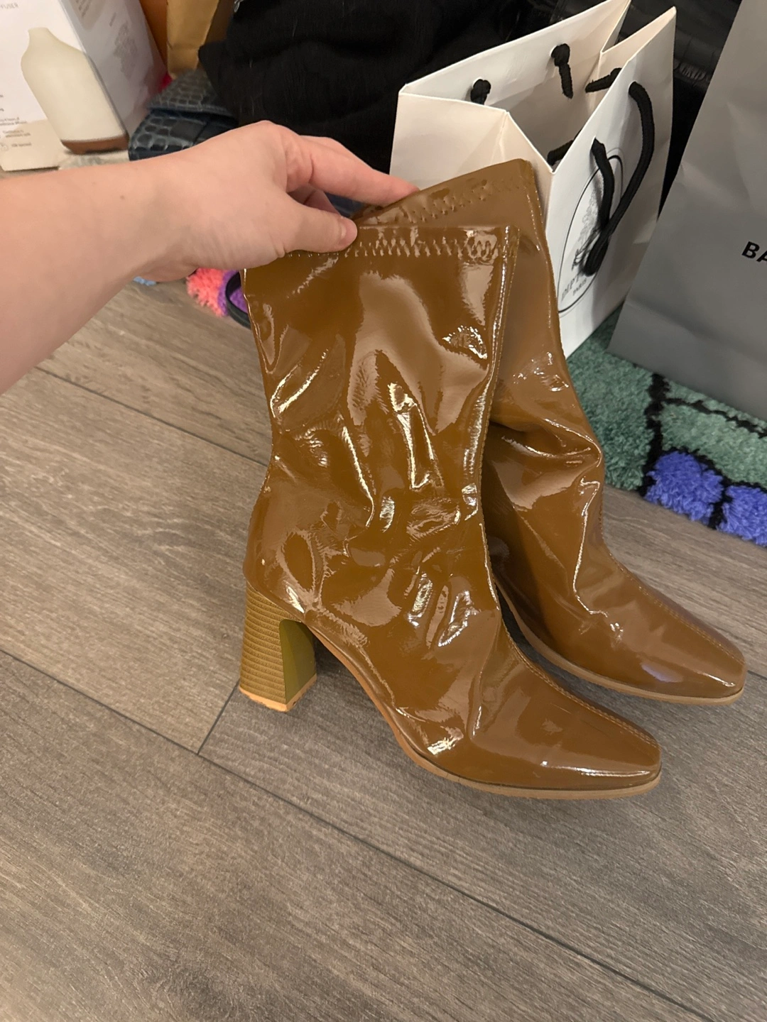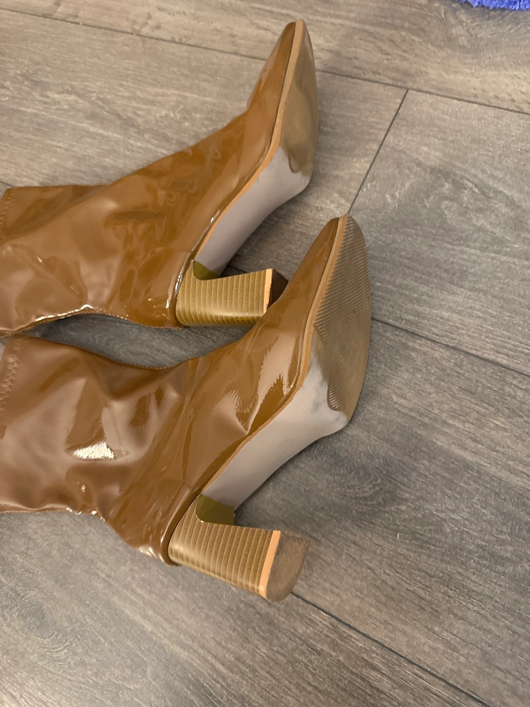 Gorgeous brown patent leather boots. Block heel. Square toe. Mid-calf height. Stretchy material. So easy to walk in! Buy three items from my listings and get one under 10 for free! Multiple purchases come with decent discounts!