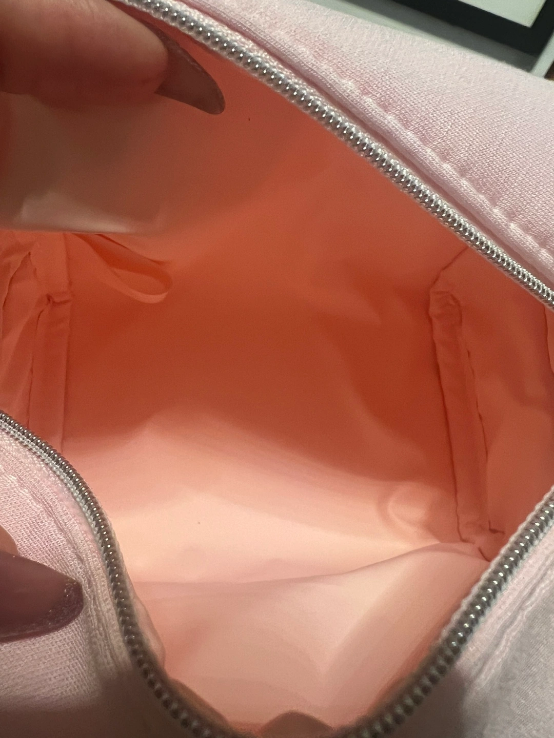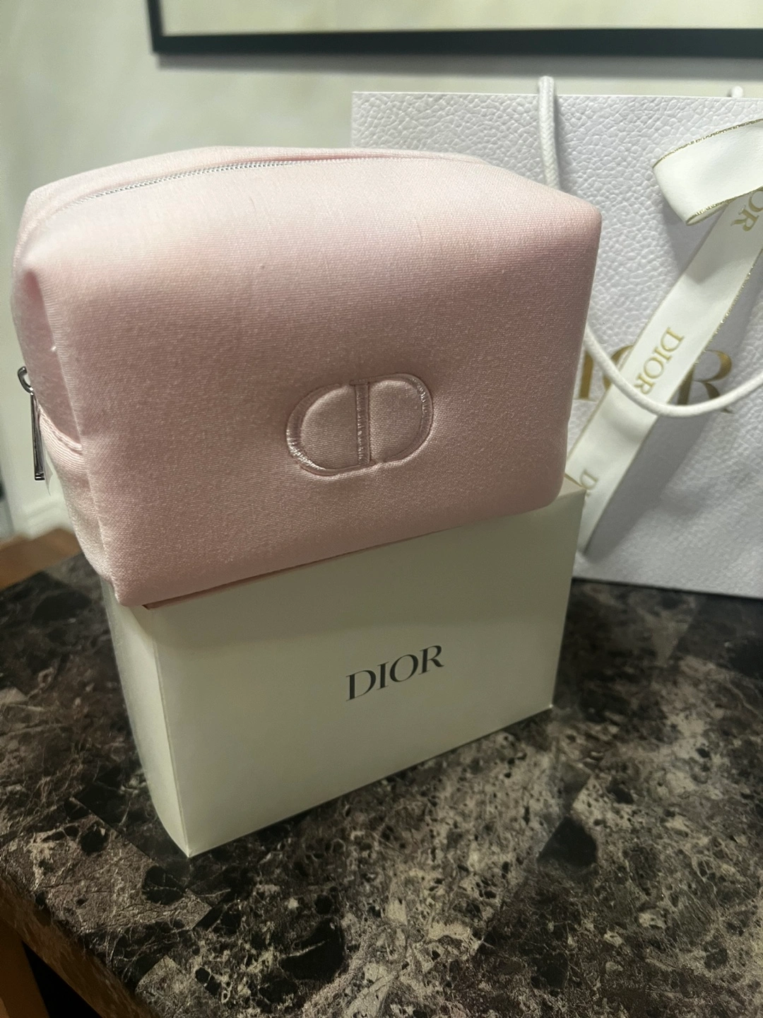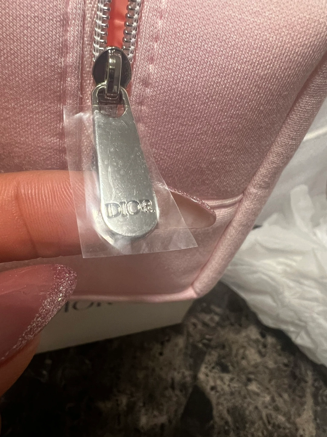 Adorable pink Dior cosmetic bag. Soft material, plastic lined for easy clean, zipper closure. Perfect for travel, makeup or everyday use. Width: 5” Length: 6” Pick up only at Yorkdale or STC Tags: DIOR, original, authentic, new with tags, gift idea, pink cosmetic bag