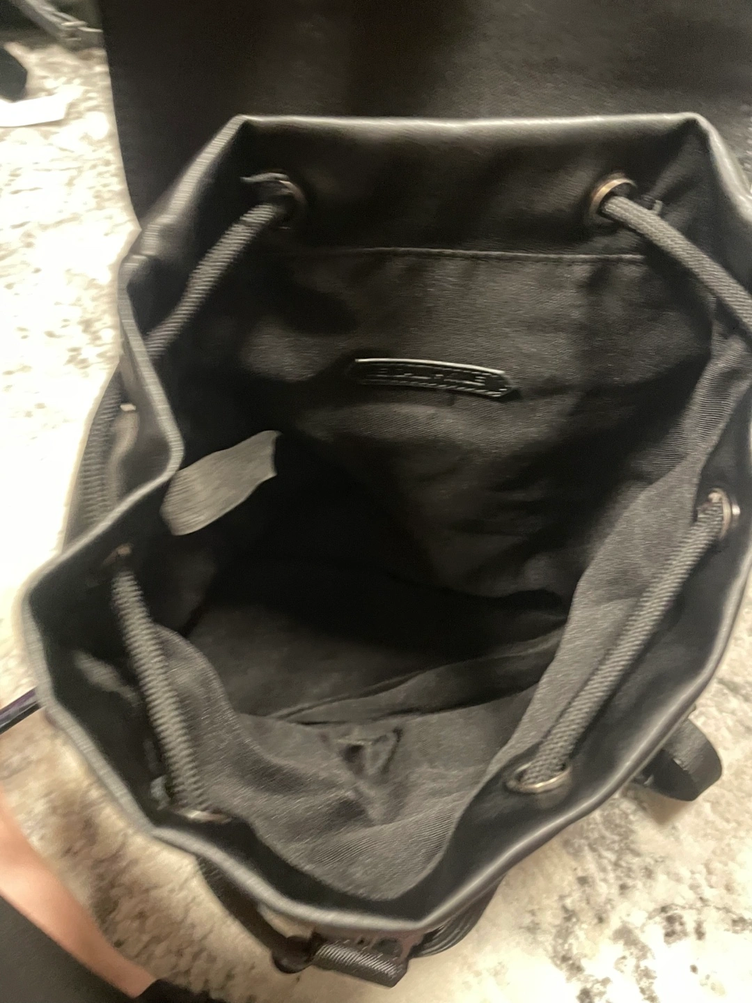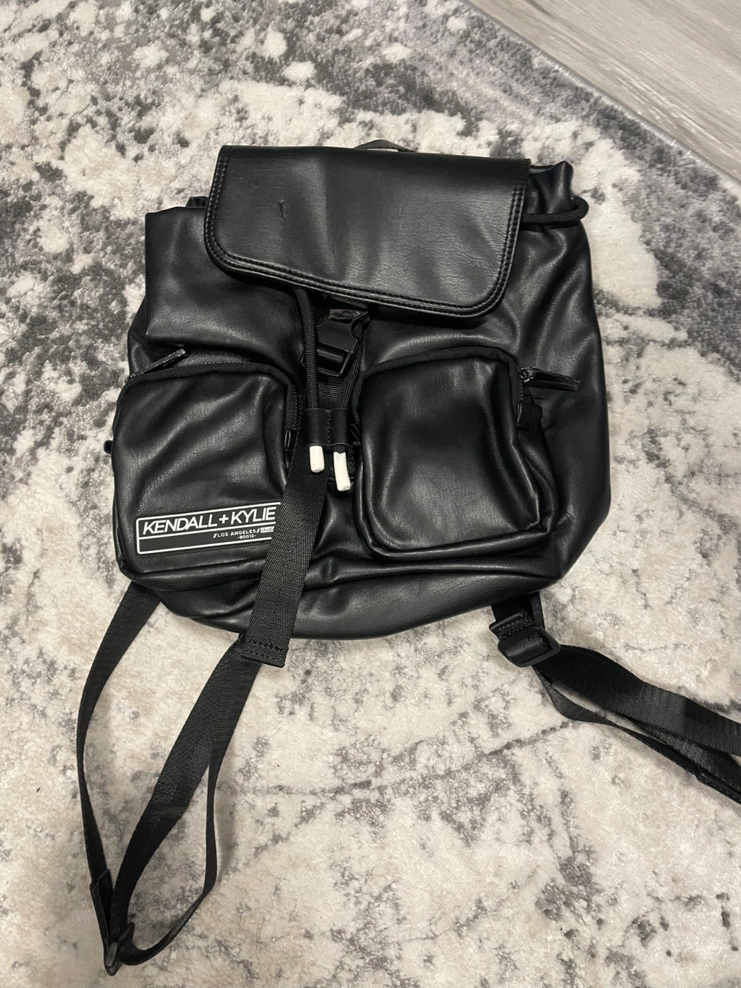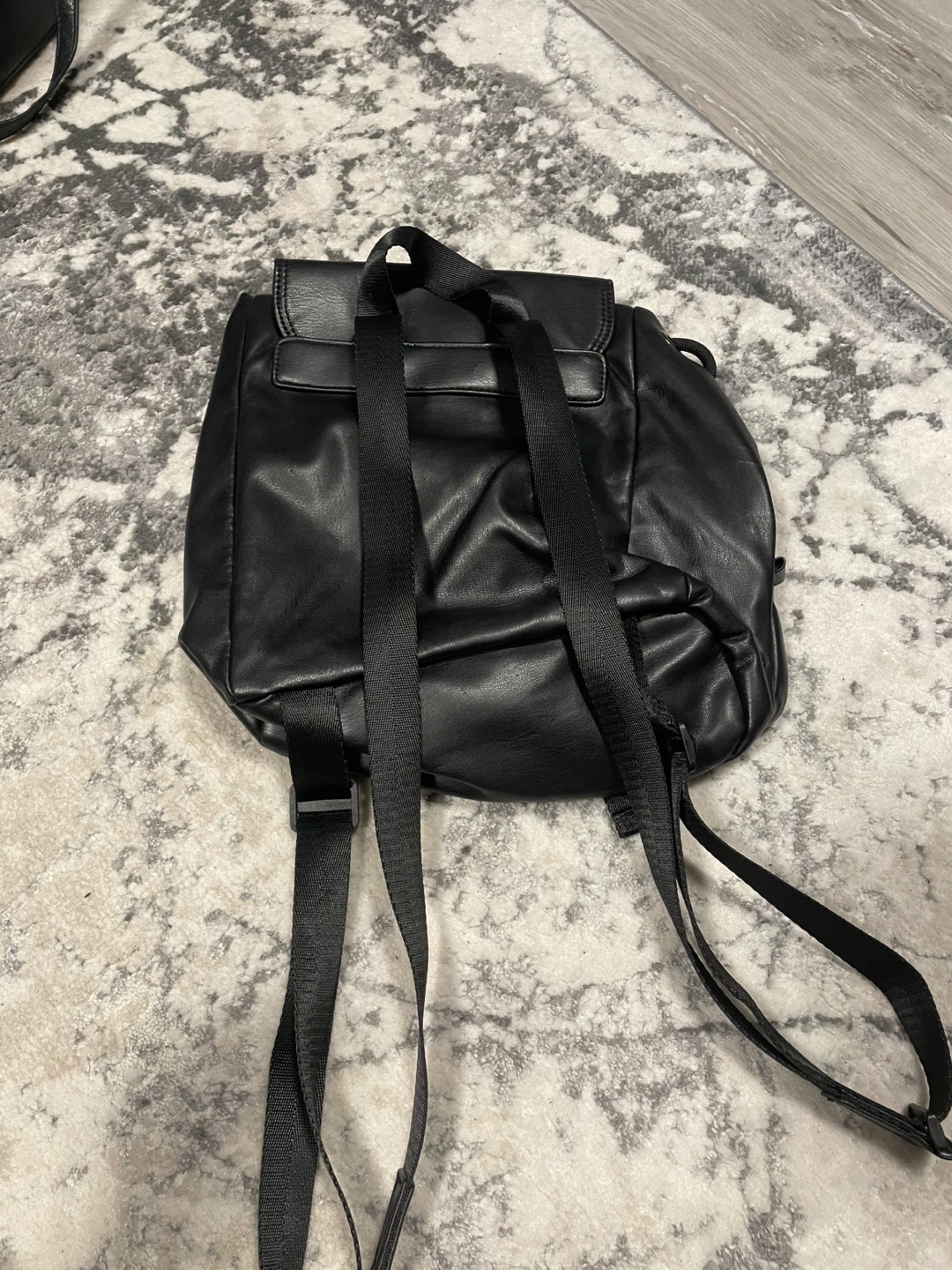 Small black backpack. Drawstring closure. Adjustable straps. Multiple pockets. Faux leather.